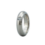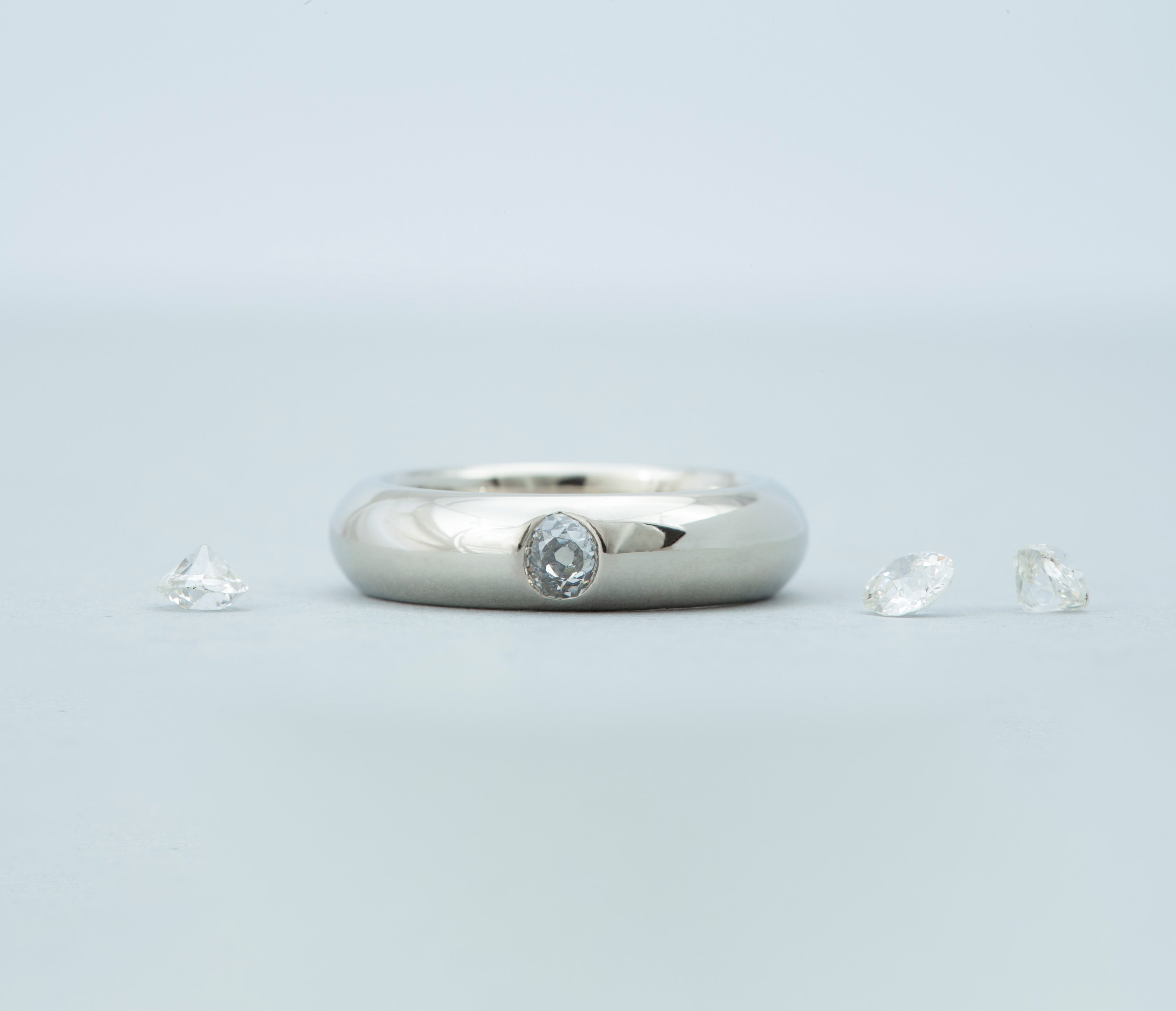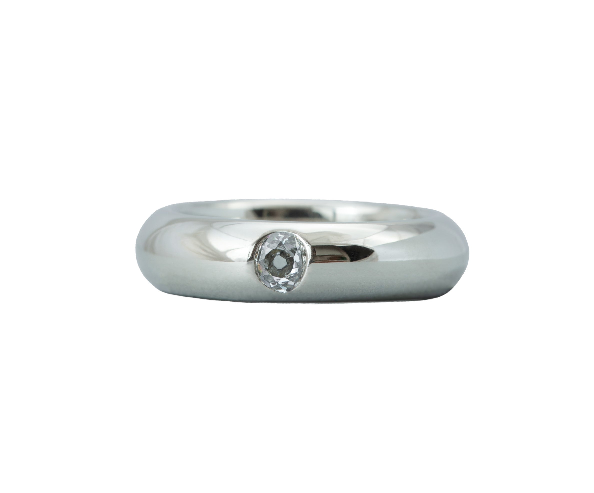 Little, chunky, high domed feller with a 14K white gold 5mm band. Set with a 0.22ct old mine cut diamond (D-F color). Perfect for someone looking for a minimal everyday diamond ring to wear.