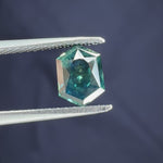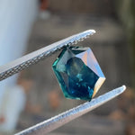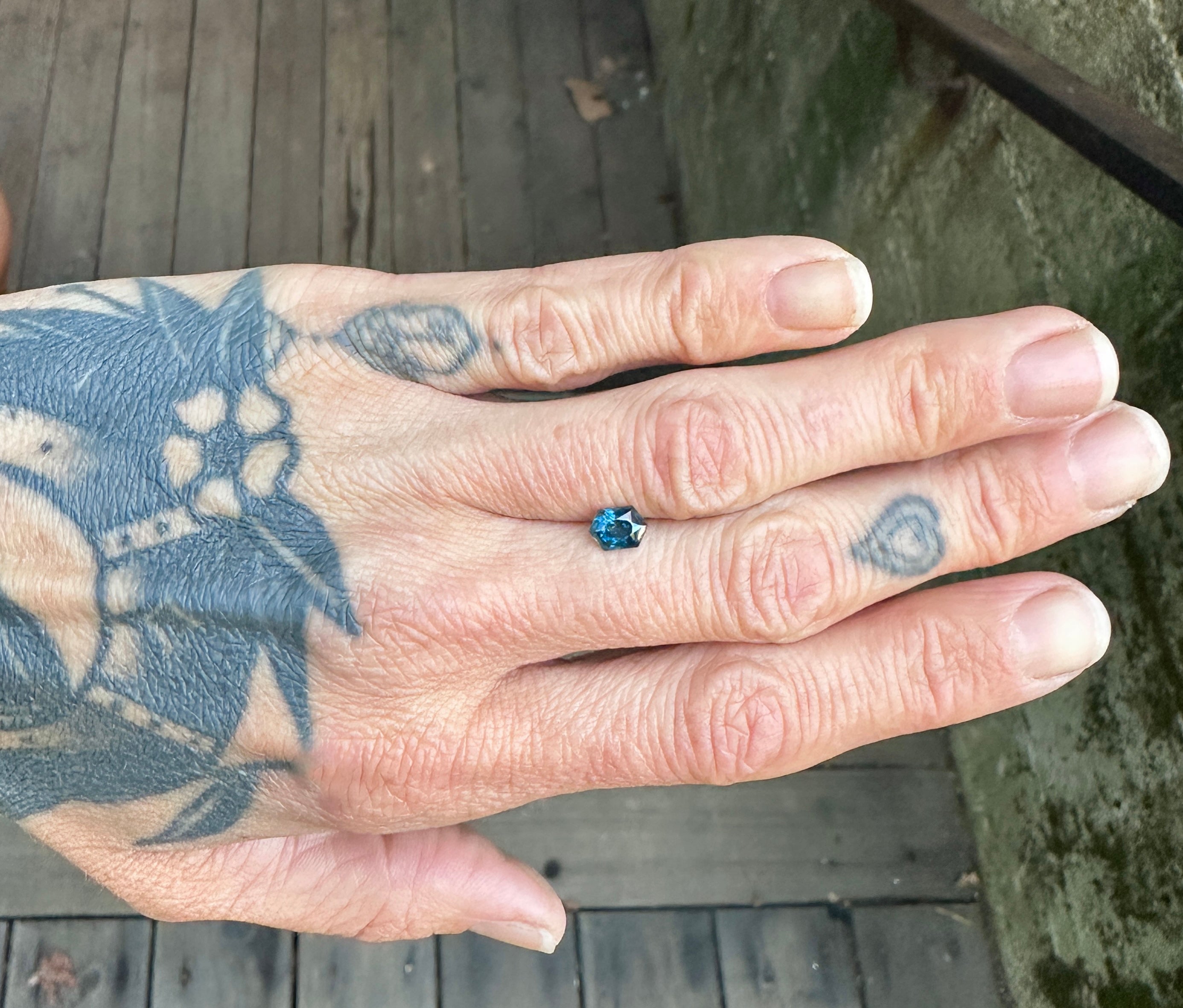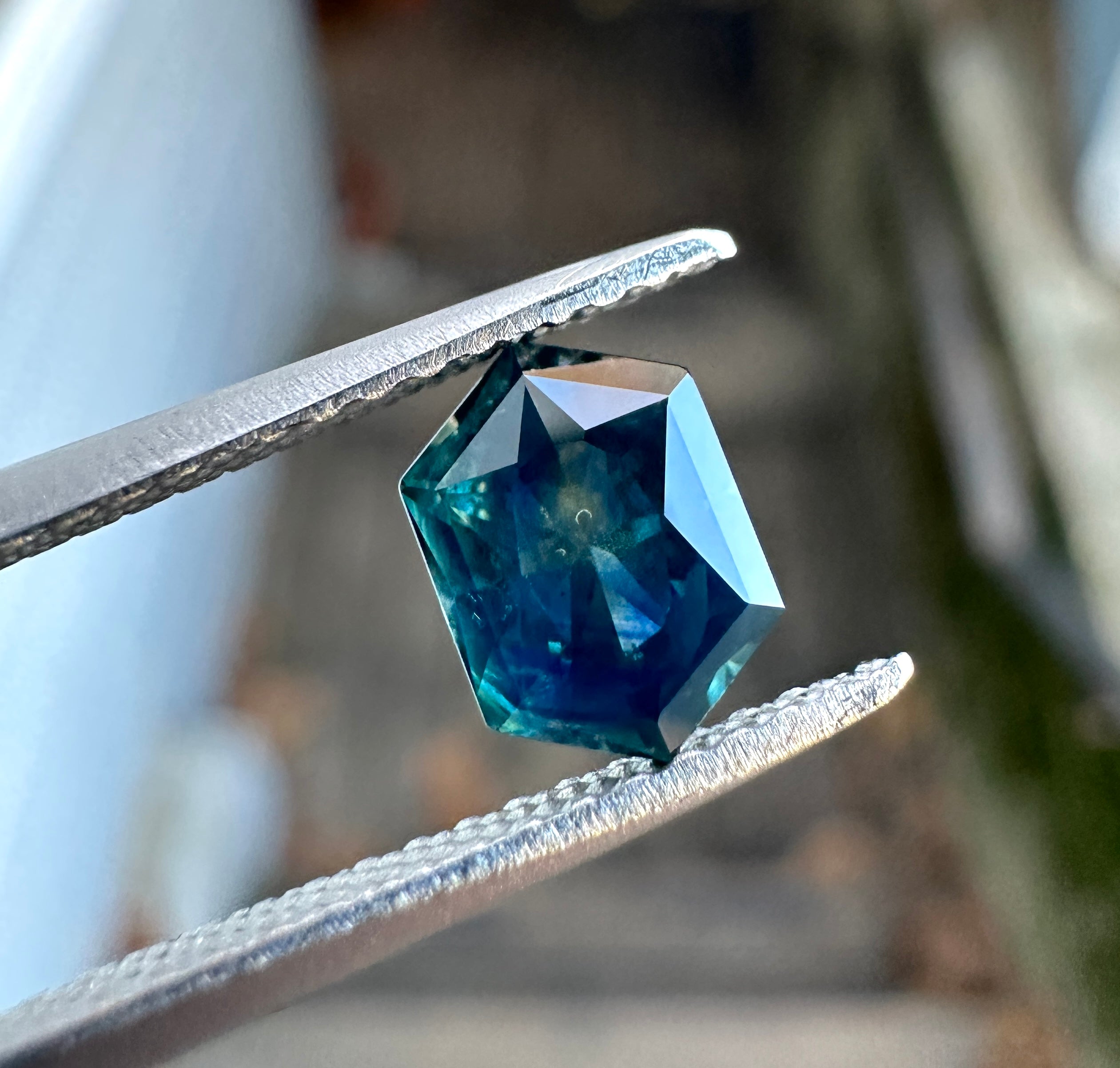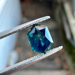 This lovely Rock Creek hexagon sapphire is blue but shows some teal characteristic in certain lighting. This may be due to the small yellow triangle zoning near the center.  This sapphire is heated and measures 6.02 x 4.97mm.