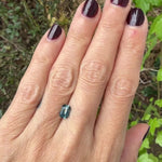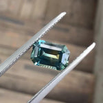 This is a parti teal, rectangular shape, emerald-cut sapphire from Rock Creek, Montana. This beautiful stones shifts from blue to green to teal.