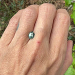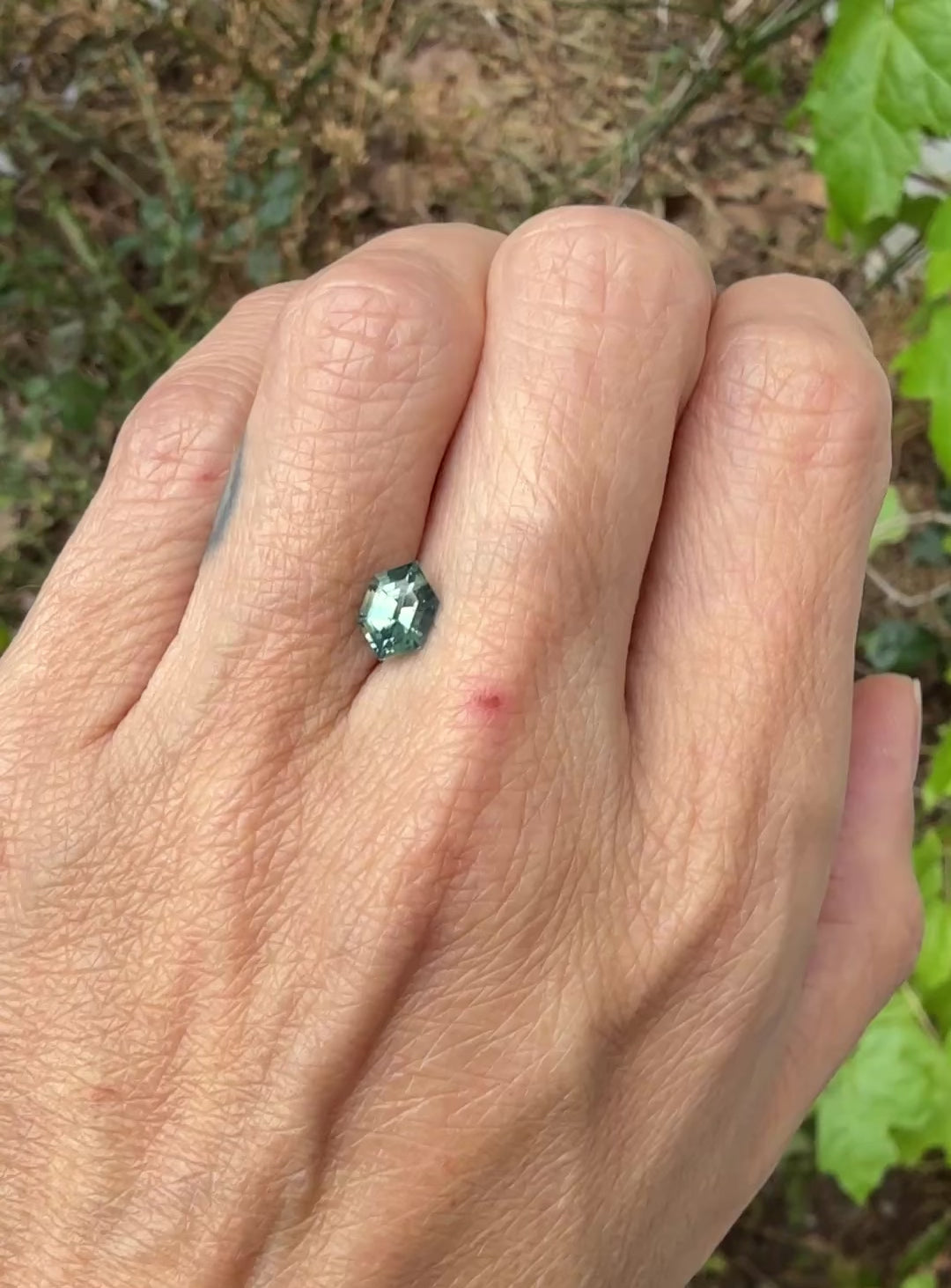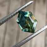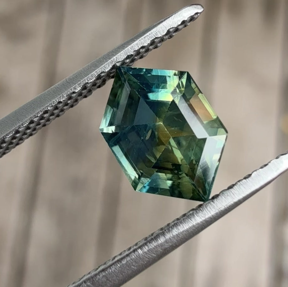 This special 1.08ct parti hexagon sapphire is a rich green, with flashes of teal and yellow. The stone has been heat-treated for color and clarity, and measures 7.65mm x 5.27mm x 3.96mm.