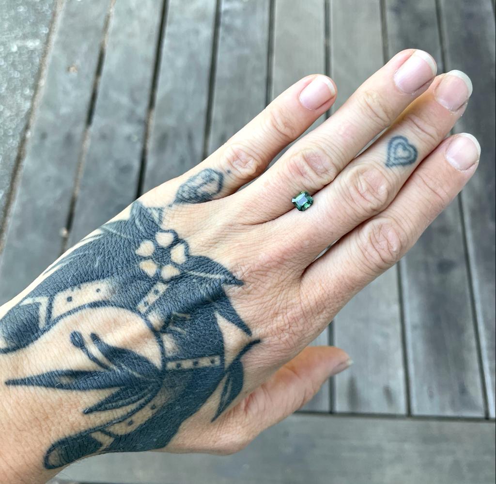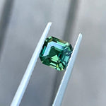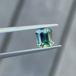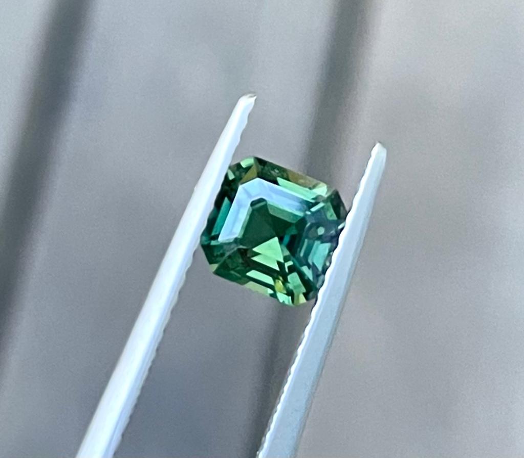 This 1.10ct green asscher-cut sapphire appears to be a little longer in one direction and we would classify it as a rectangular-shaped stone. Heated.