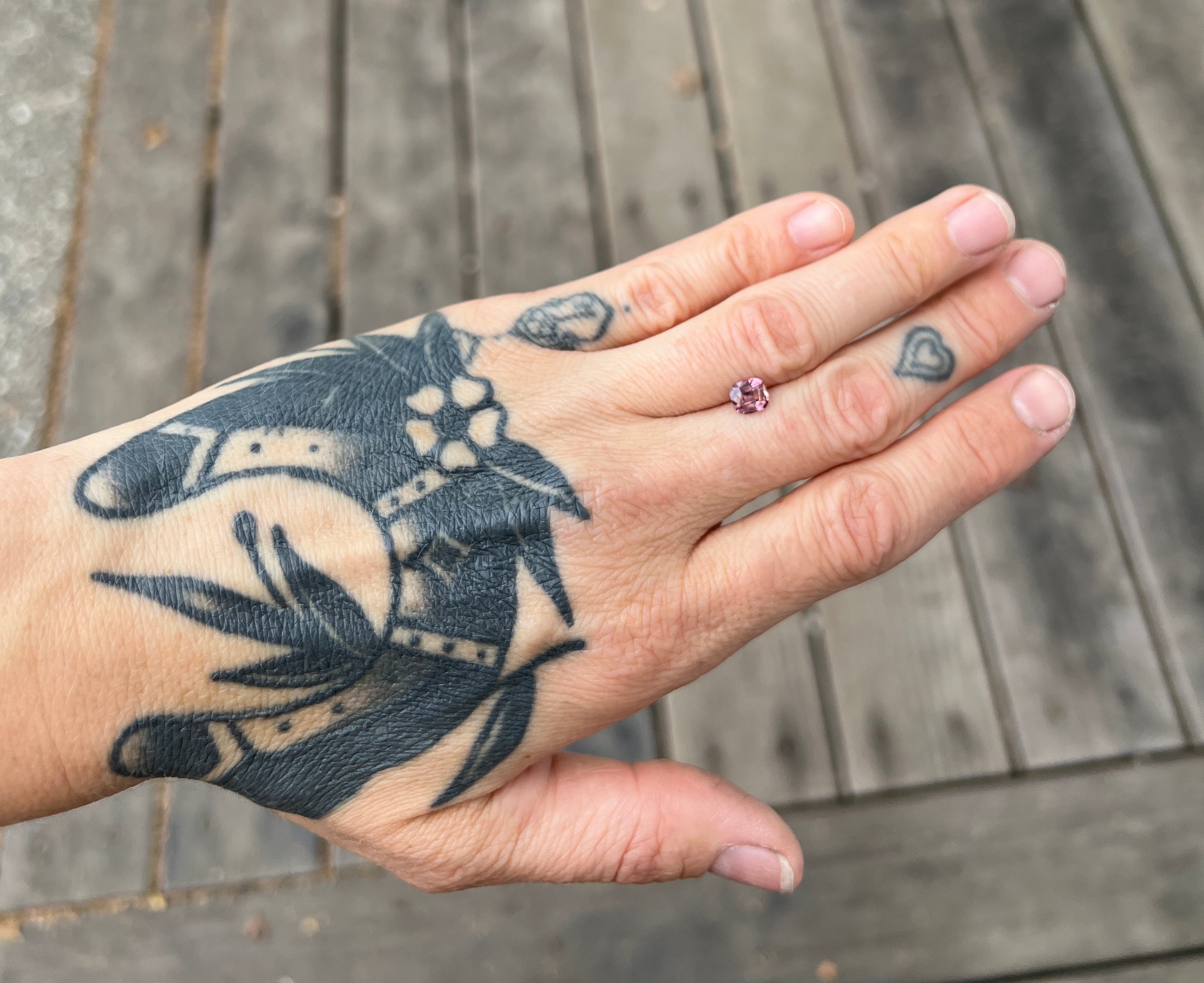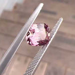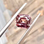 This lovely cushion-shaped stone shifts in different lighting situations. It can be quite vibrant pink/magenta with a peach tone but in the light it's more of a magenta-maroon-cognac color. This is one of Sarah's favorite color ranges in sapphire. This stone is heated.