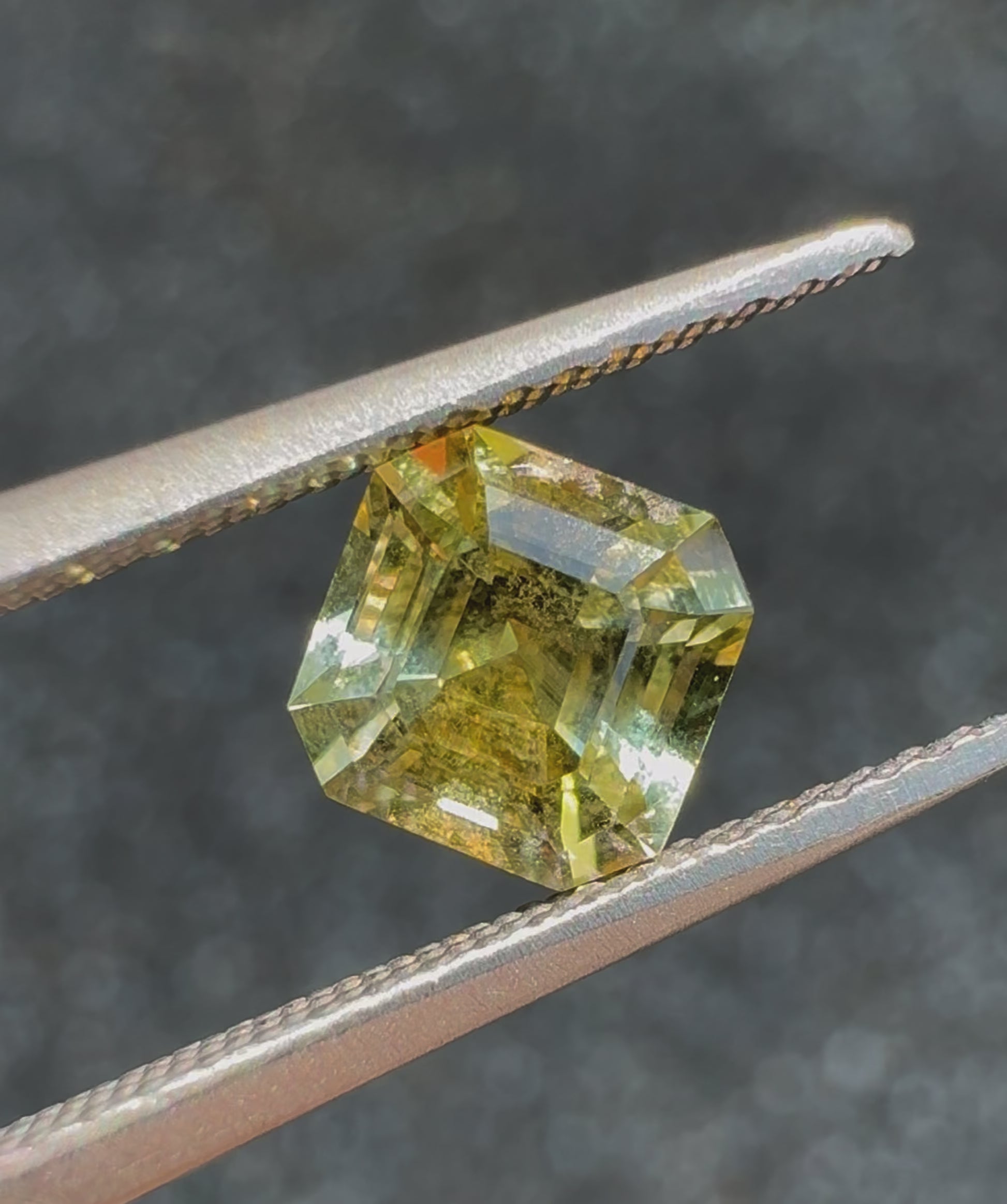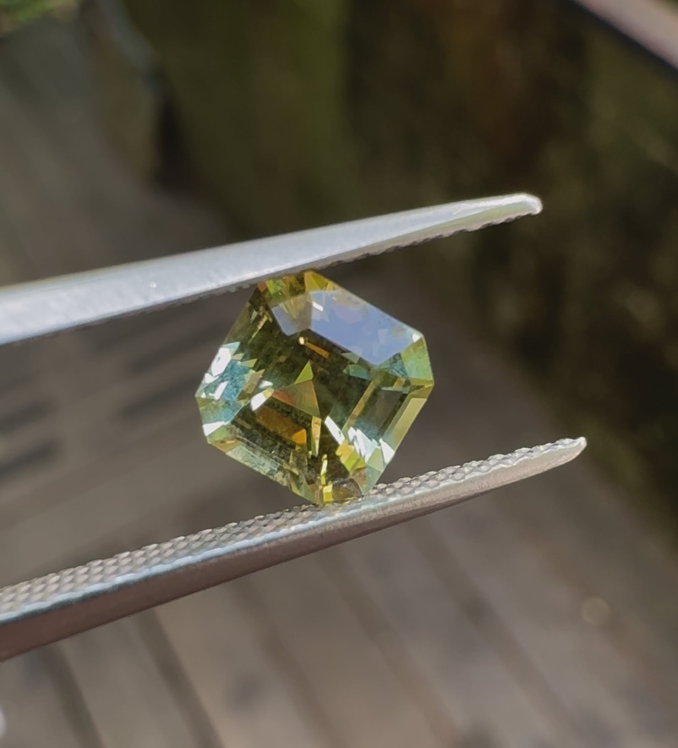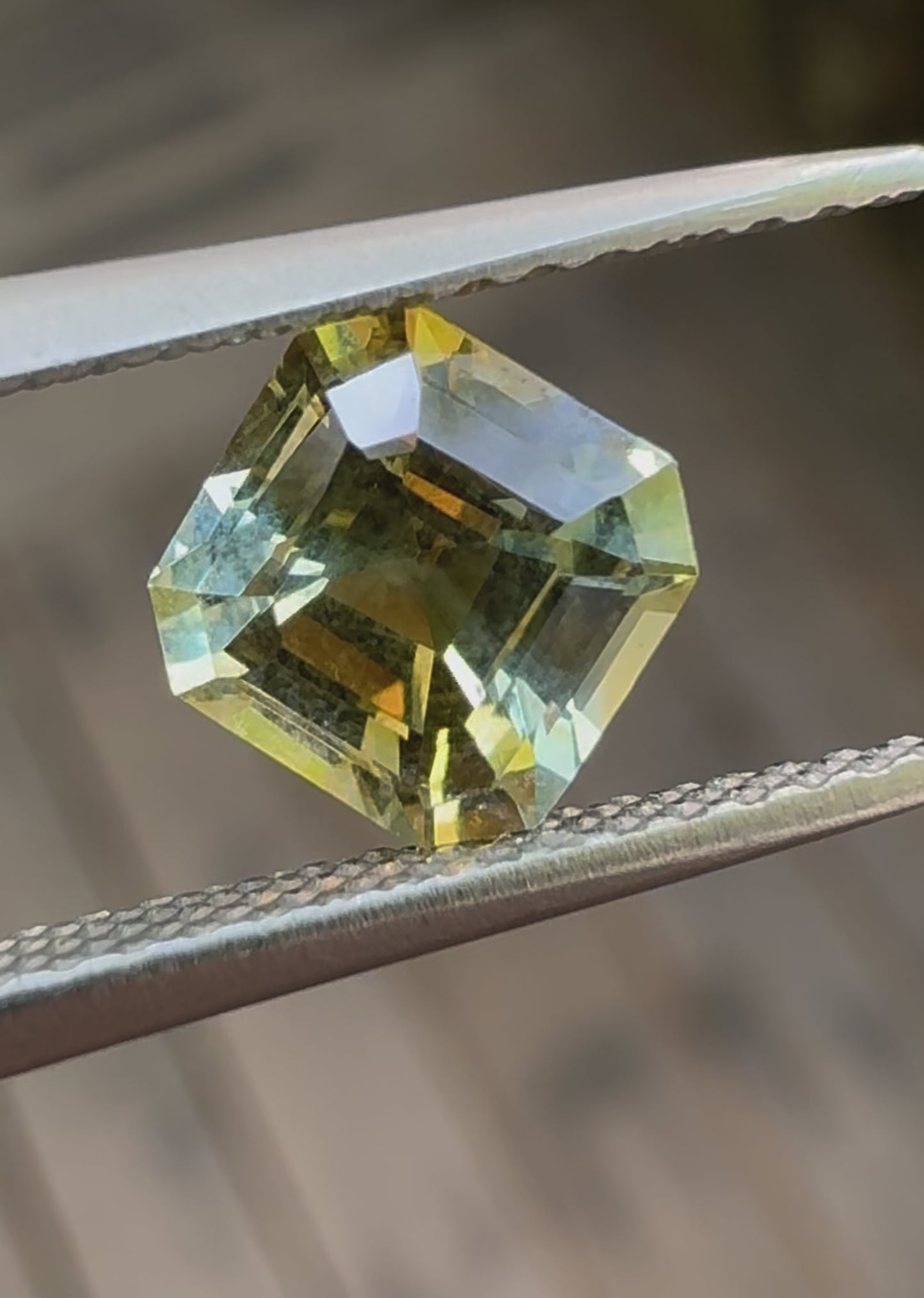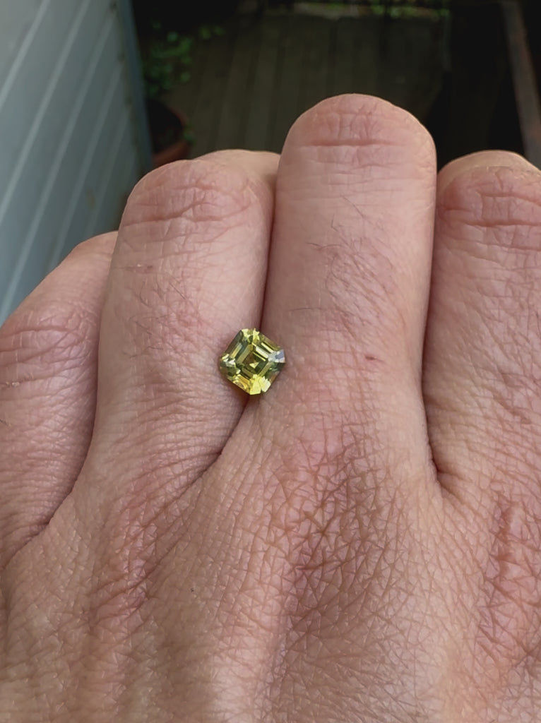1.39ct yellow with slight hints of blue asscher sapphire from Rock Creek, Montana. This stone has been heated.
