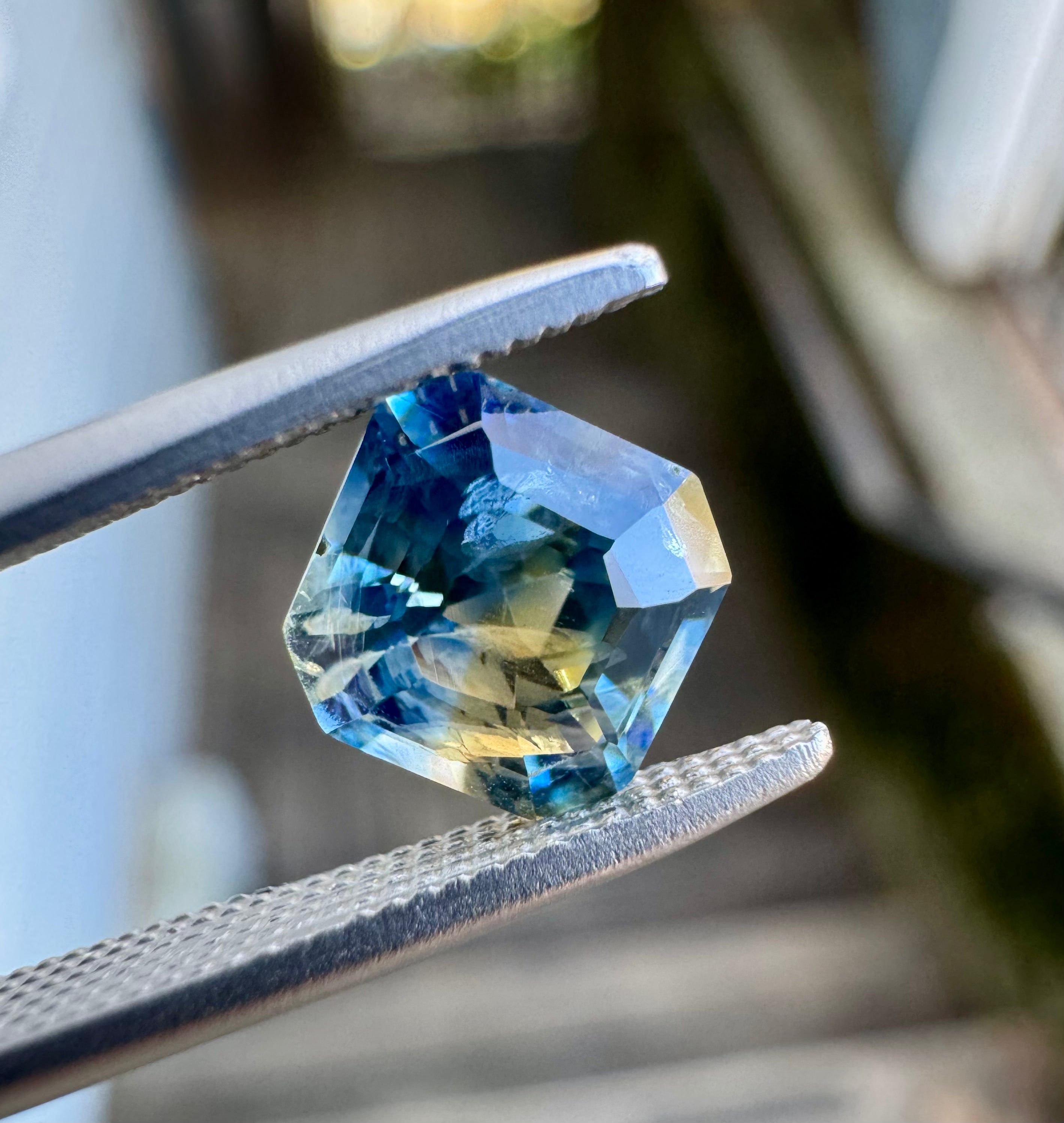 This is a really excellent 1.42ct parti sapphire from Rock Creek, Montana. This stone has distinct blue, yellow, and white zones. It has been heated