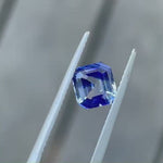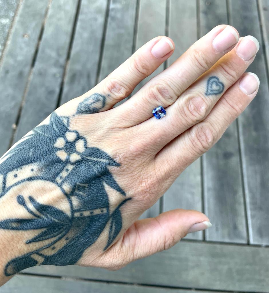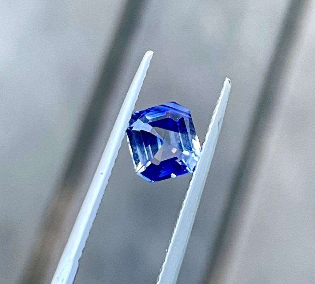 1.43ct Blue/White Sapphire with fun deep blue zones and striping throughout the stone. This stone is not perfectly square but it is close. We would categorize it as a rectangle because it is not a perfect square.