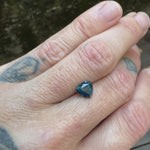 This trillion from Rock Creek, Montana shows blues to teals in most light. In the sun, you are able to catch yellow zones and silk strands encompassing the yellow eye in the center. It has been heated and measures 7.00mm tip to tip.