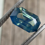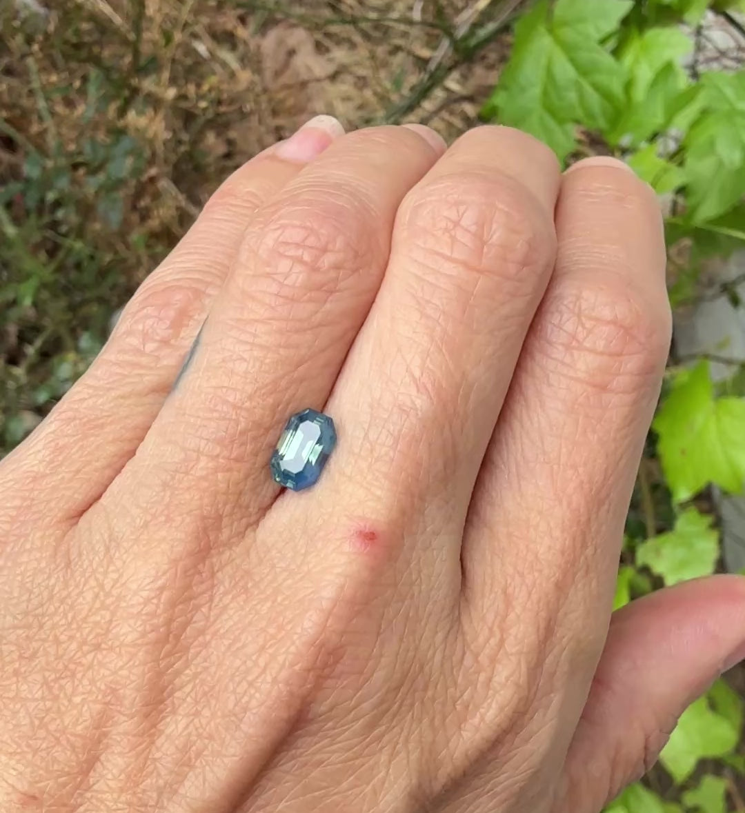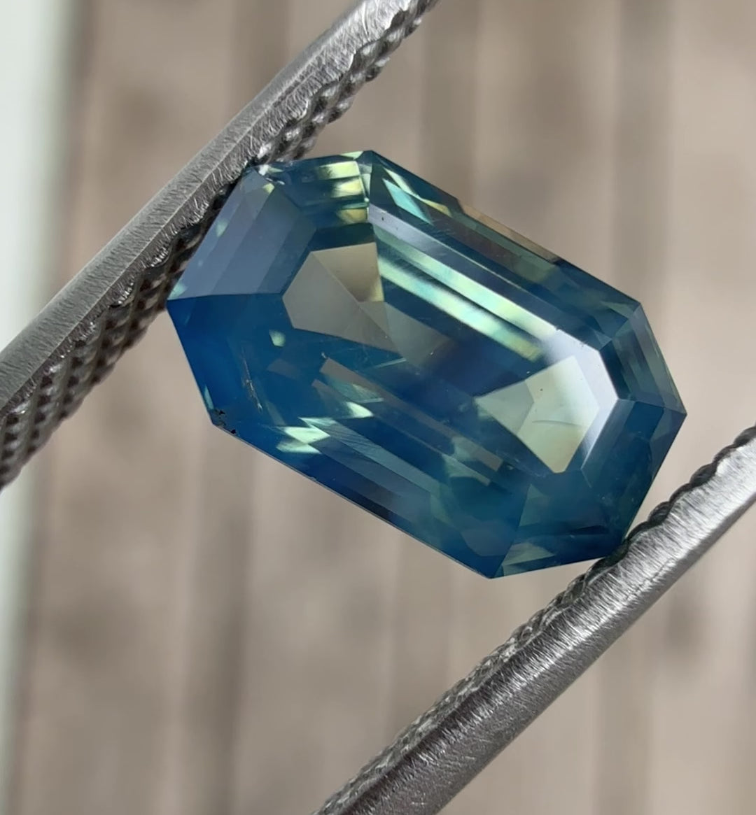 1.52ct opalescent rectangular blue striped sapphire. It's cloudy, it's bright, it's beautiful.
