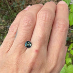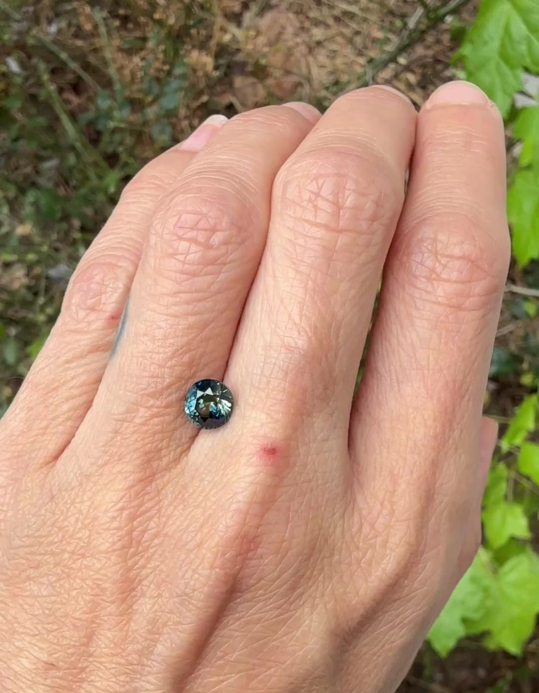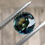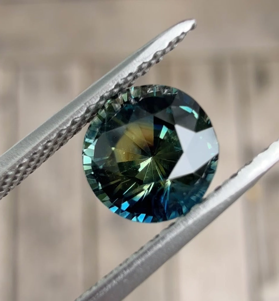 A 1.53ct round teal parti sapphire with flashes of blue and yellow. We are unaware if this stone has undergone any heat treatment. The stone measures 6.39mm x 4.93mm.