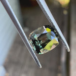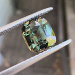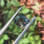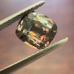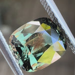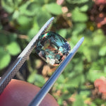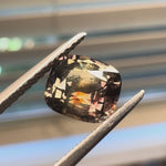 This sapphire exhibits similar qualities to other songea sapphires we've seen. With an eclectic range of colors mixing around and a color change we will do out best to describe. In indoor lighting the stone appears magenta, honey, amber, cola colored, outside we see some of the rutile shimmer in the sunlight. The rutile is predominantly brown/golden within a mostly green stone. As you can see in the many videos, this stone is difficult to describe.