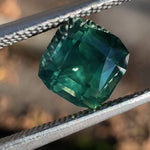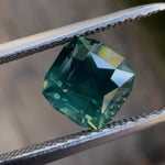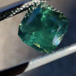 1.60ct opalescent green cushion sapphire. This stone is cut really well. We don't if the stone has been heated, so we must assume that it has.