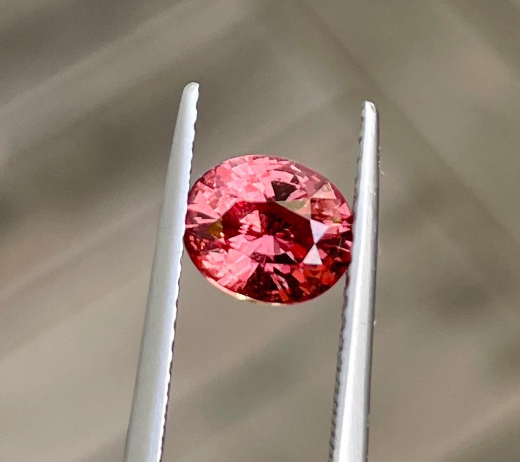 This padparadscha exhibits a slight brown color in certain lighting and is extremely vibrant.
