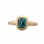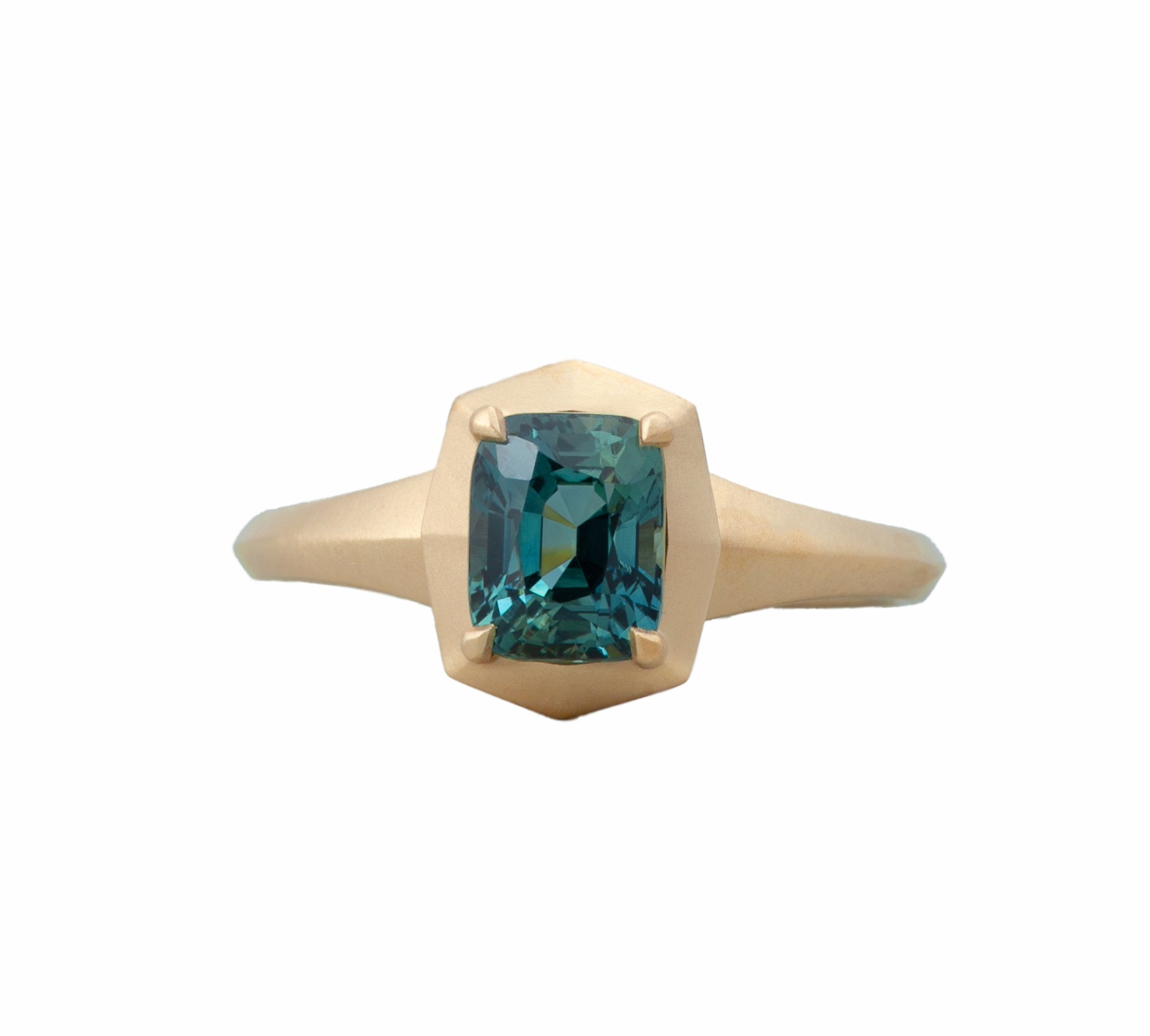 Audrey, our beloved elegant solitaire setting in 14K yellow gold satin finish, paired with a 1.73ct blue cushion rectangular sapphire.