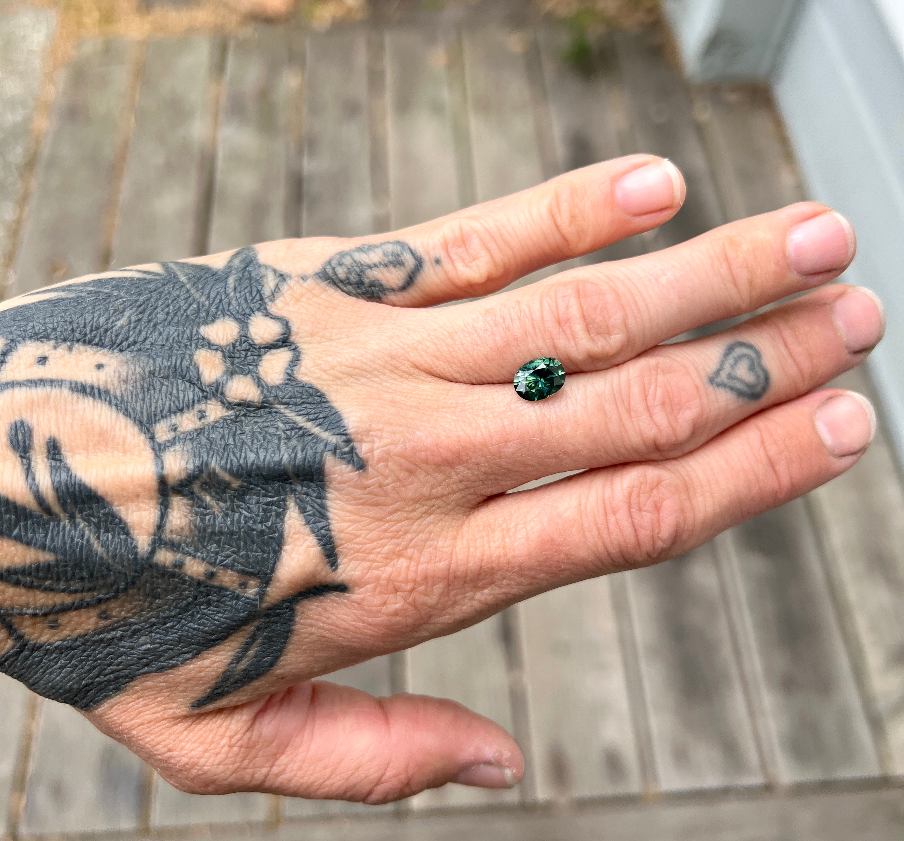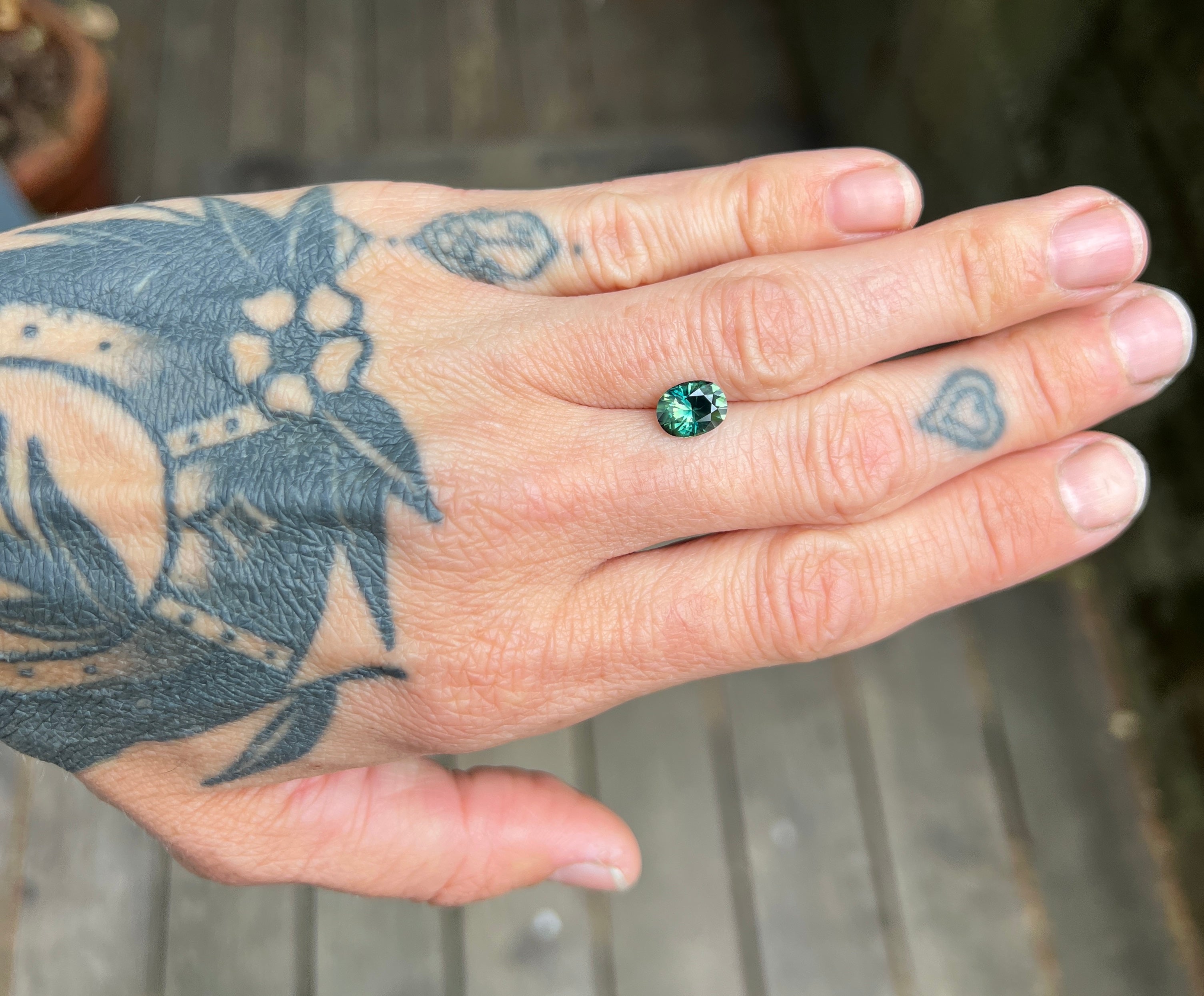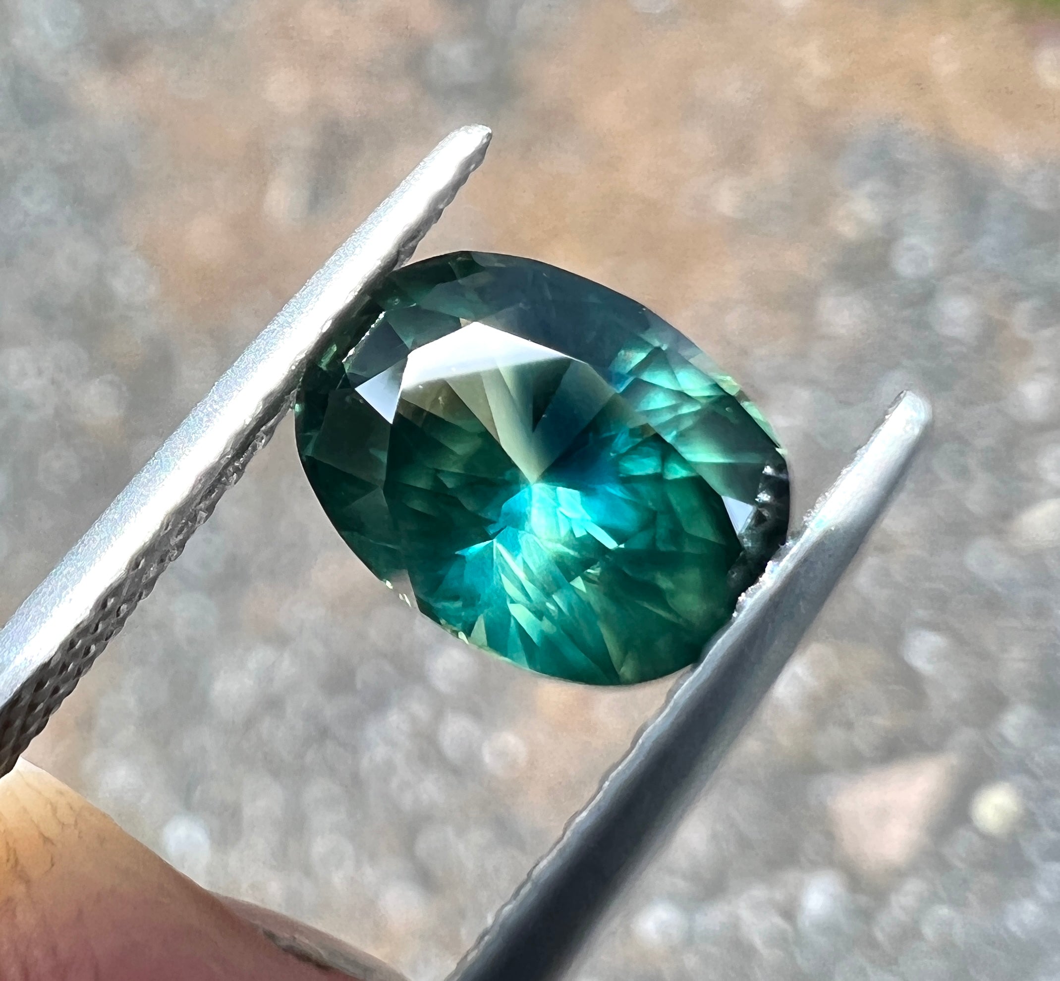 We're listed this heated sapphire as "teal" but it clearly will show you a few colors within. Yellow and blue zoning mix together to create a dreamy peacock teal color. Measures 8.52 x 6.59mm