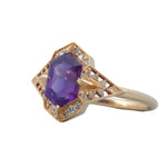 Moody deep purple-fuschia milky purple sapphire. We're not too sure how to describe this stone. The color is unlike anything I have seen before. The elongated hexagon sapphire in this hollyhock ring weighs 2.20ct. The stone is heated and is from Madagascar.