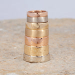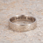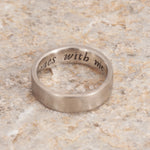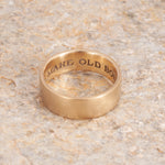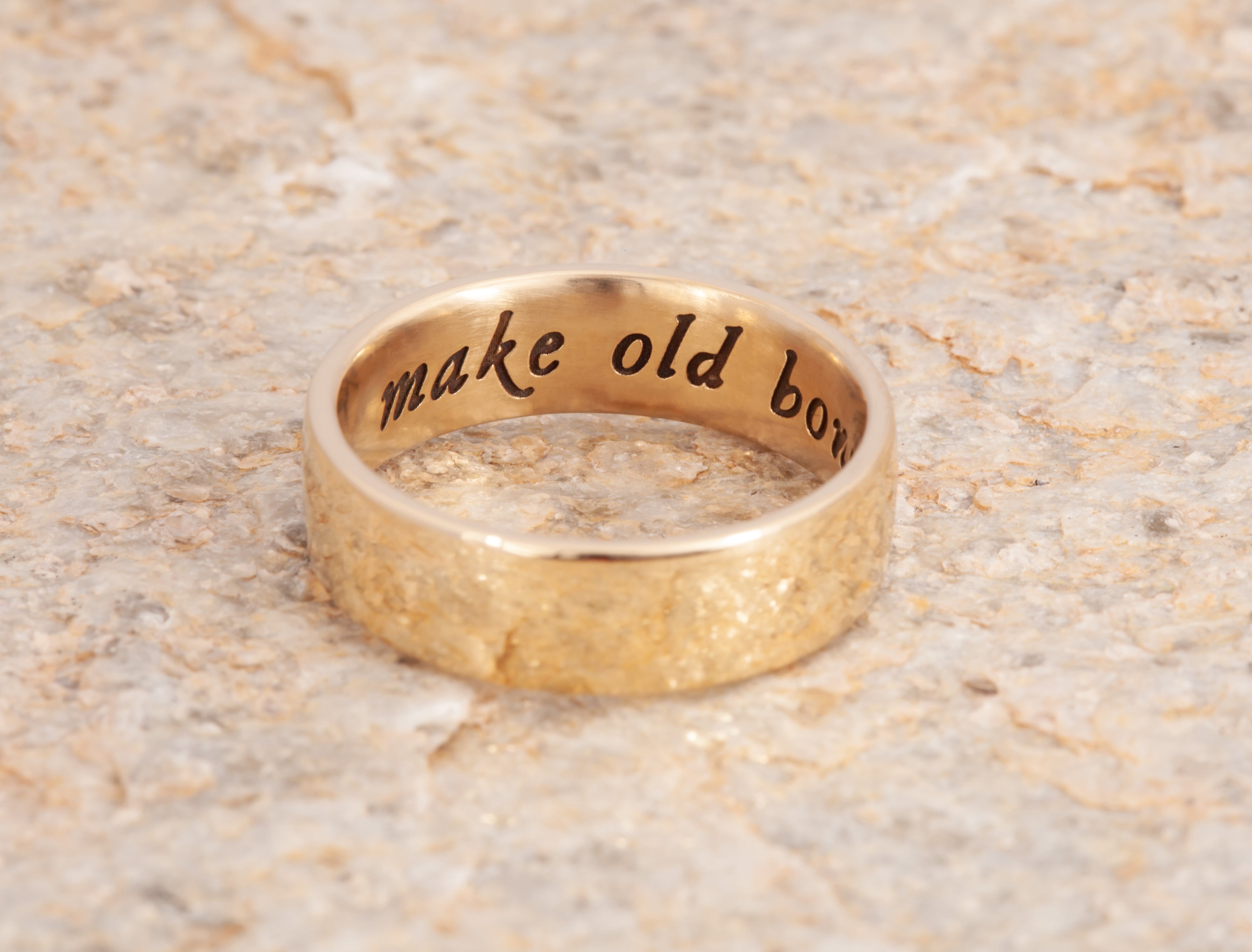 The Make Old Bones bands come in 4-5-6-7-8-9mm +/- in any metal of your choosing. All rings will come with a high polished unless you request texture. We offer a sandblasted finish, satin brush finished, rougher texture upon request. You may choose the upper case font or the script. Please add to your notes when checking out.
