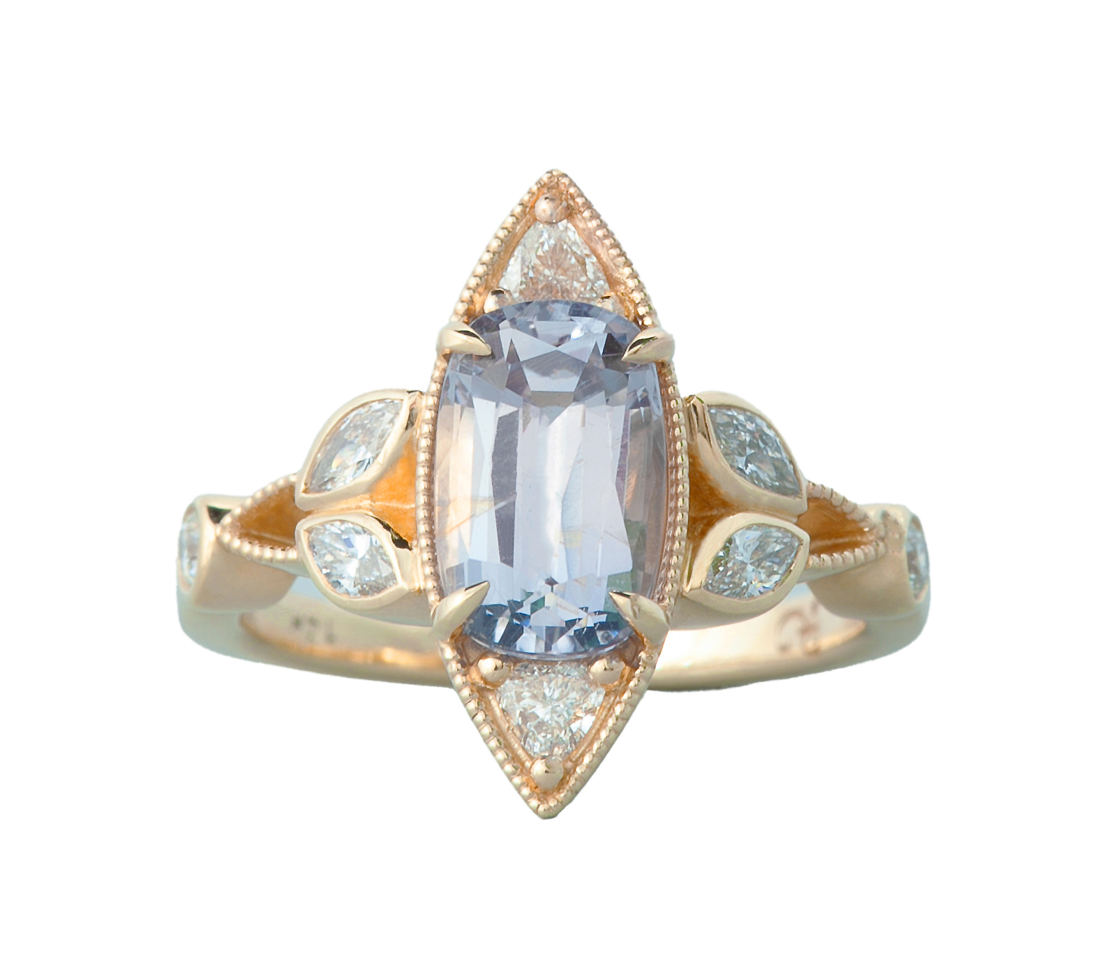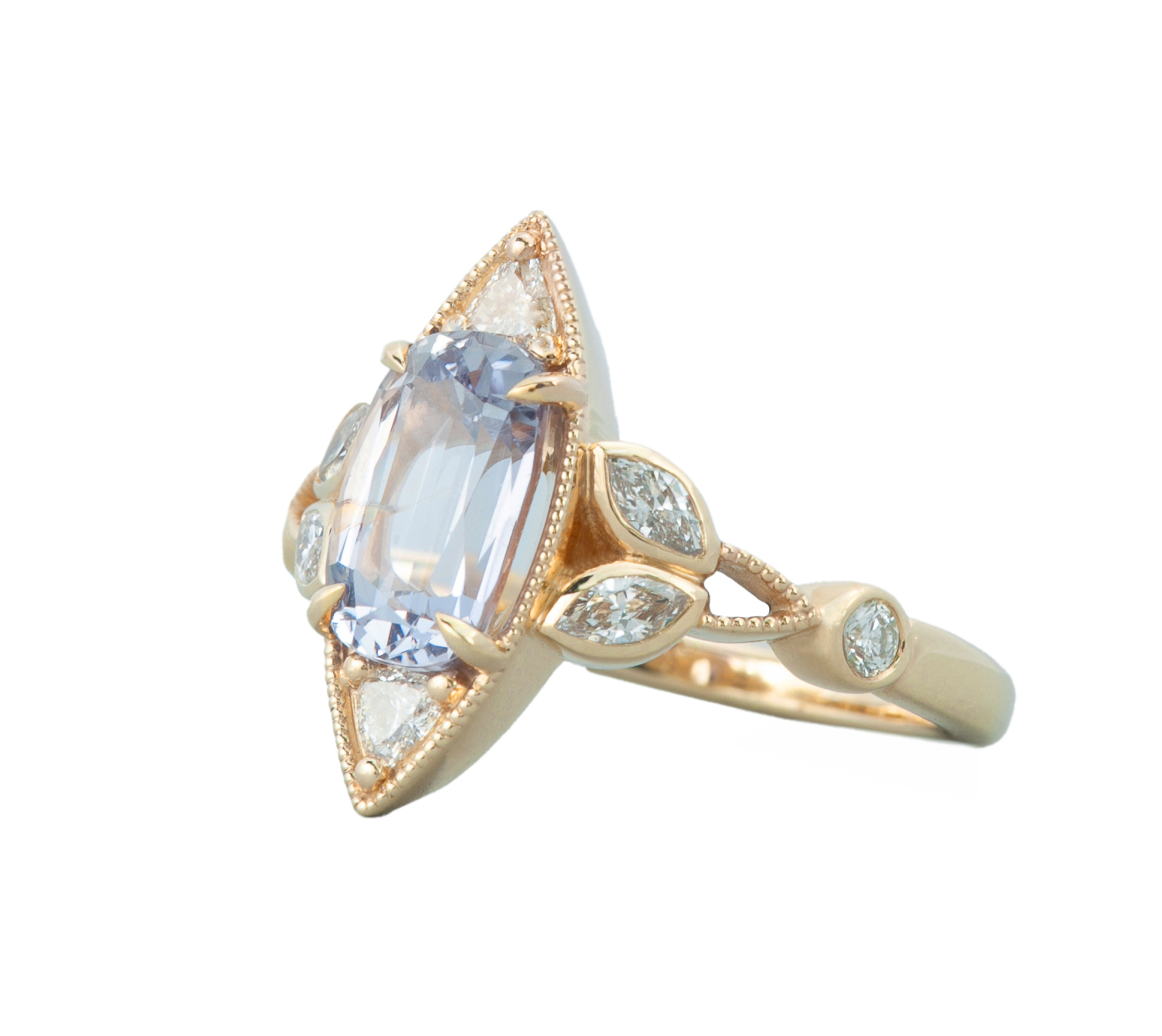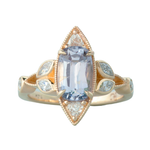 This customized Morgana ring came about when we couldn't find the right marquise center stone. We added a pair of trillion diamonds to the top and bottom of the 2.48ct unheated light lavender grey sapphire from Umba, Tanzania. A unique property found inside many Umba sapphires is the appearance of needles within the stone making them some of our favorite sapphires. The Morgana Setting consists of 4 additional marquise diamonds and 2 rounds. Set in 14k Yellow Gold. Email us to customize your own!