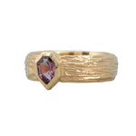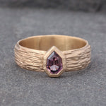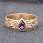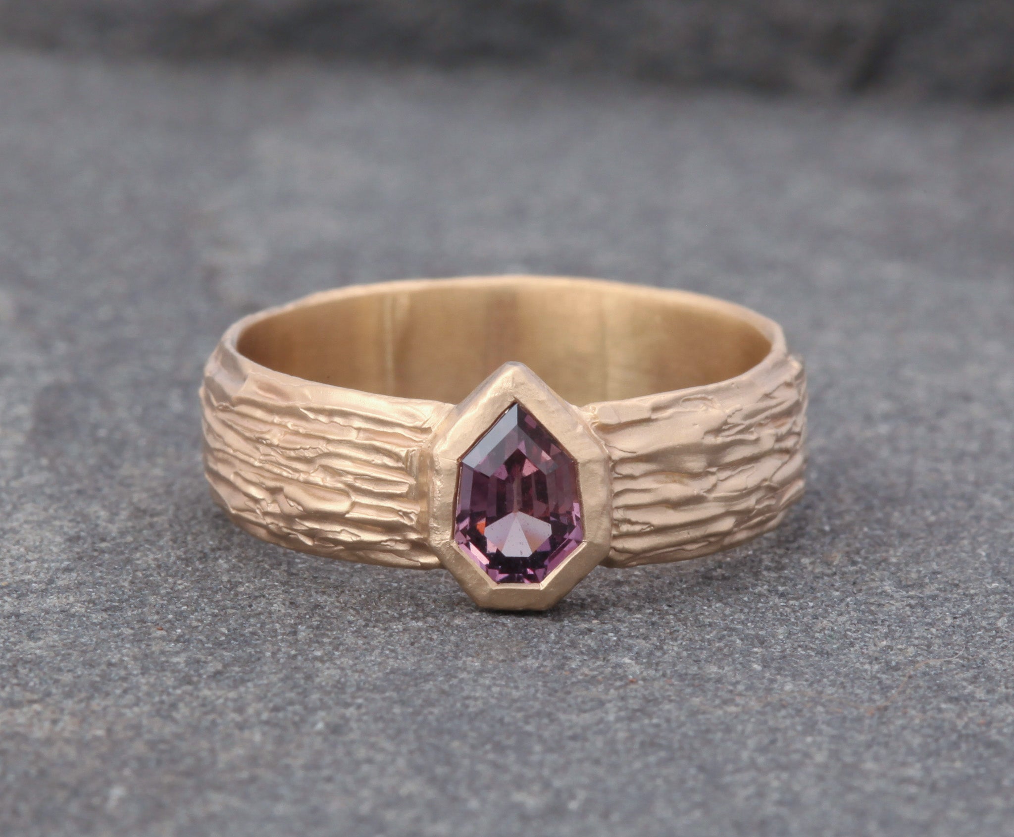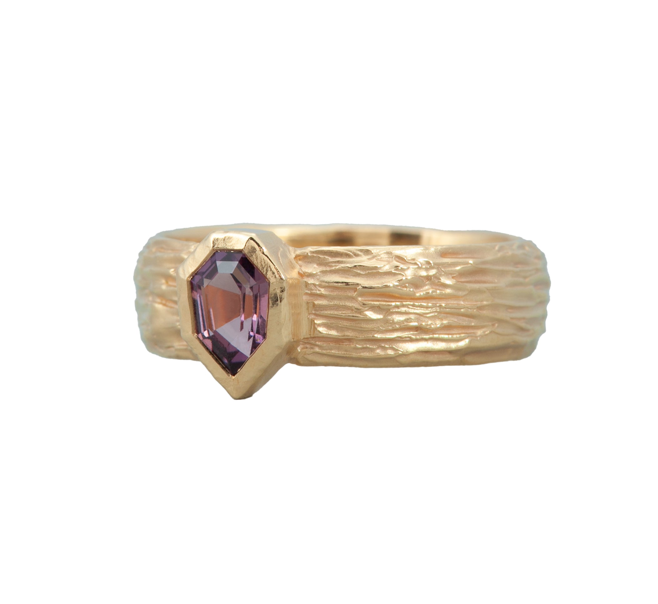 This 14k yellow gold ring band is crafted and hand-carved with our signature "Elder" texture, highlighting the dimensional qualities of the metal in which it is cast. The wax-carved texture balances the refinement of fine jewelry and the inspiration of natural form, individual and unique each time. Featured at the crest of the band is an approx. 0.60ct Whiskey Magenta Sapphire. The ring band measures 6mm wide.