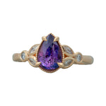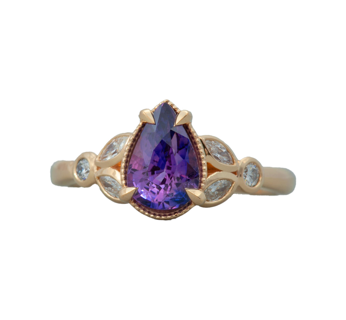 This setting has been modified from our original Morgana ring setting to best highlight this gorgeous 2.02ct purple pear unheated sapphire in 14K yellow gold. Two marquise diamonds and one round diamond flank each side of the stone giving a lovely bouquet of gems that sits comfortably on your finger and stands the test of time.