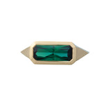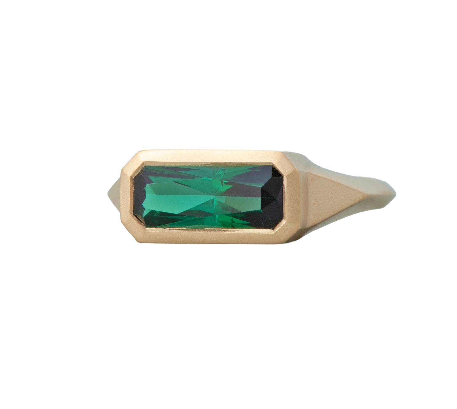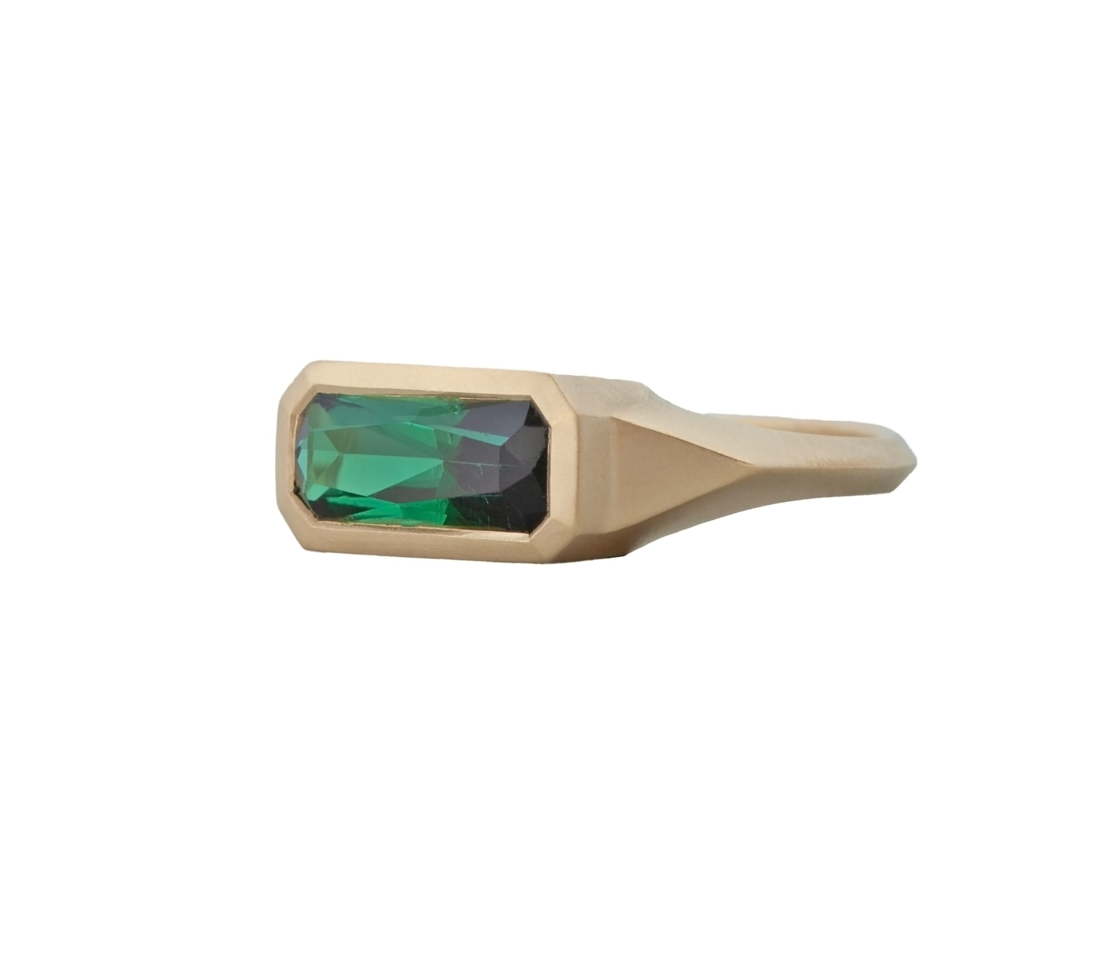 2.07ct faceted Brazilian green tourmaline set East/West in 14K Yellow Gold. This is currenly OOAK. Sizable from 5.5-10