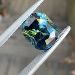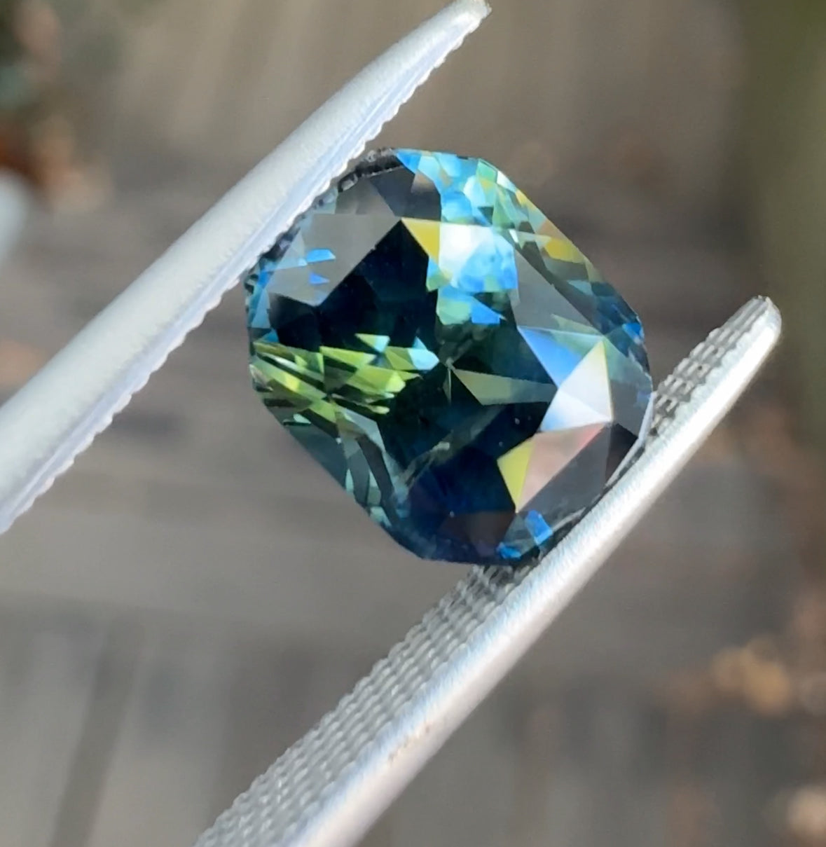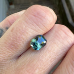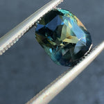 This is a lovely and clean parti sapphire. Its particularly interesting as the green is sandwiched between blue.  There is a lot of depth and character to this one due to the clarity and color. We are unsure if this stone has been heated, therefore we must assume that is has been. It measures at 8.00mm x 6.60mm.