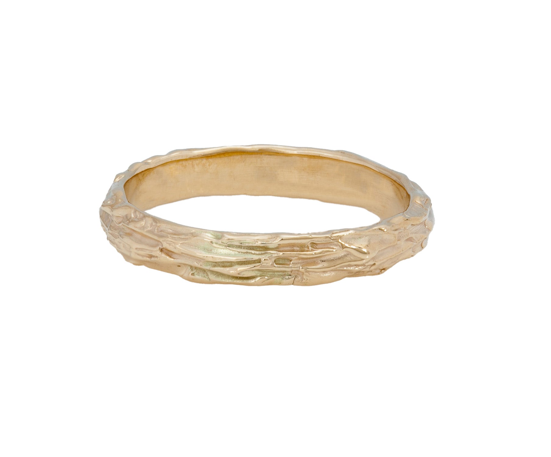 This stunning ring band is crafted and hand-carved with our signature "Elder" texture, highlighting the dimensional qualities of the metal in which it is cast. This wax-carved texture balances the refinement of fine jewelry and the inspiration of natural form, individual and unique each time. This texture can also be used on other pieces, please inquire if that interests you. This band measures 3mm wide and 1.75mm thick.