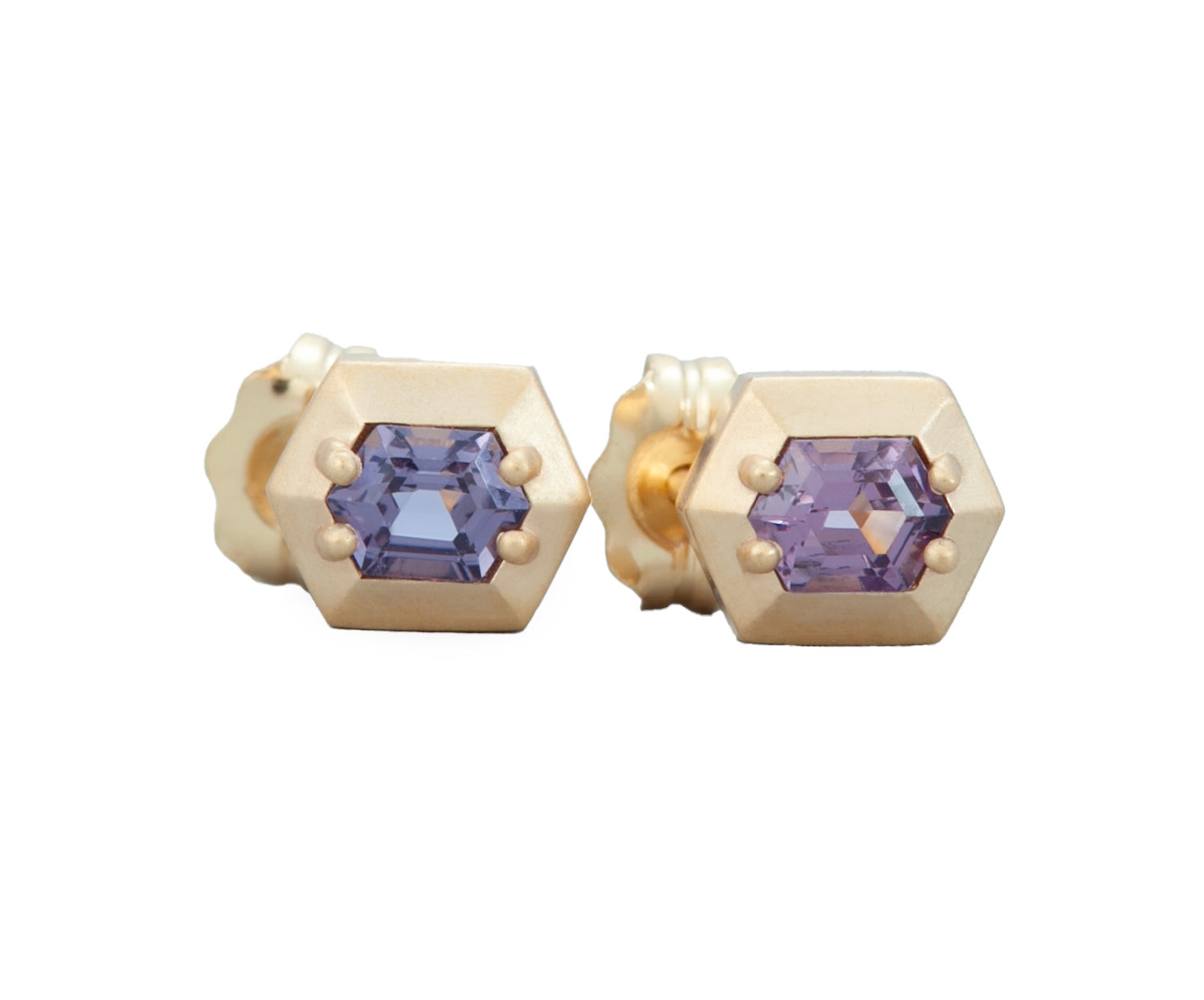 Our Audrey Spinel Studs feature elongated hexagon lavender spinels weighing 0.37ct. Each pair is hand-crafted, and set in satin finished 14k yellow gold. They measure 6.85 x 5.50mm.