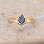 Banded Sapphire with hand engraved details and white diamond cluster in 14k Yellow Gold.