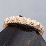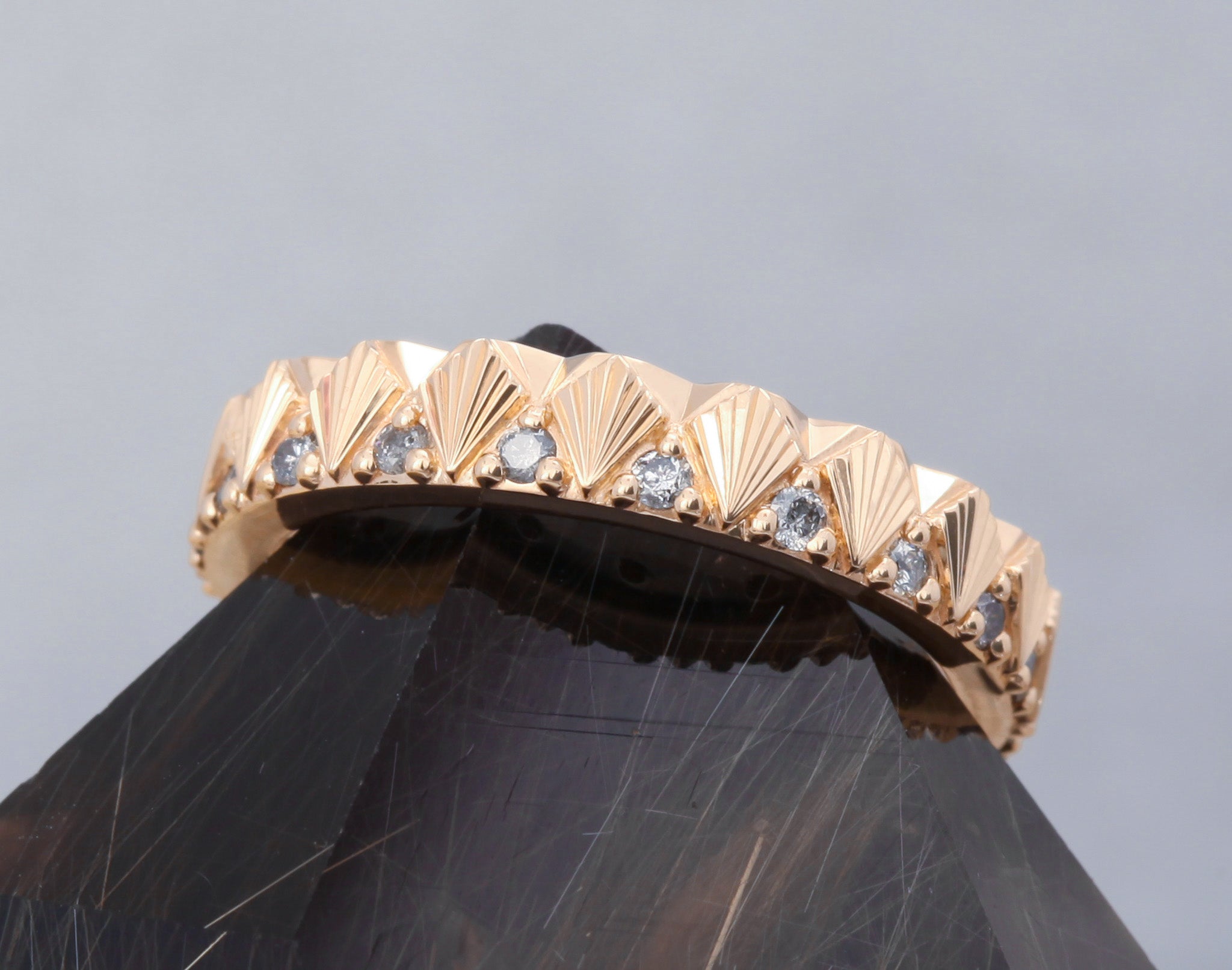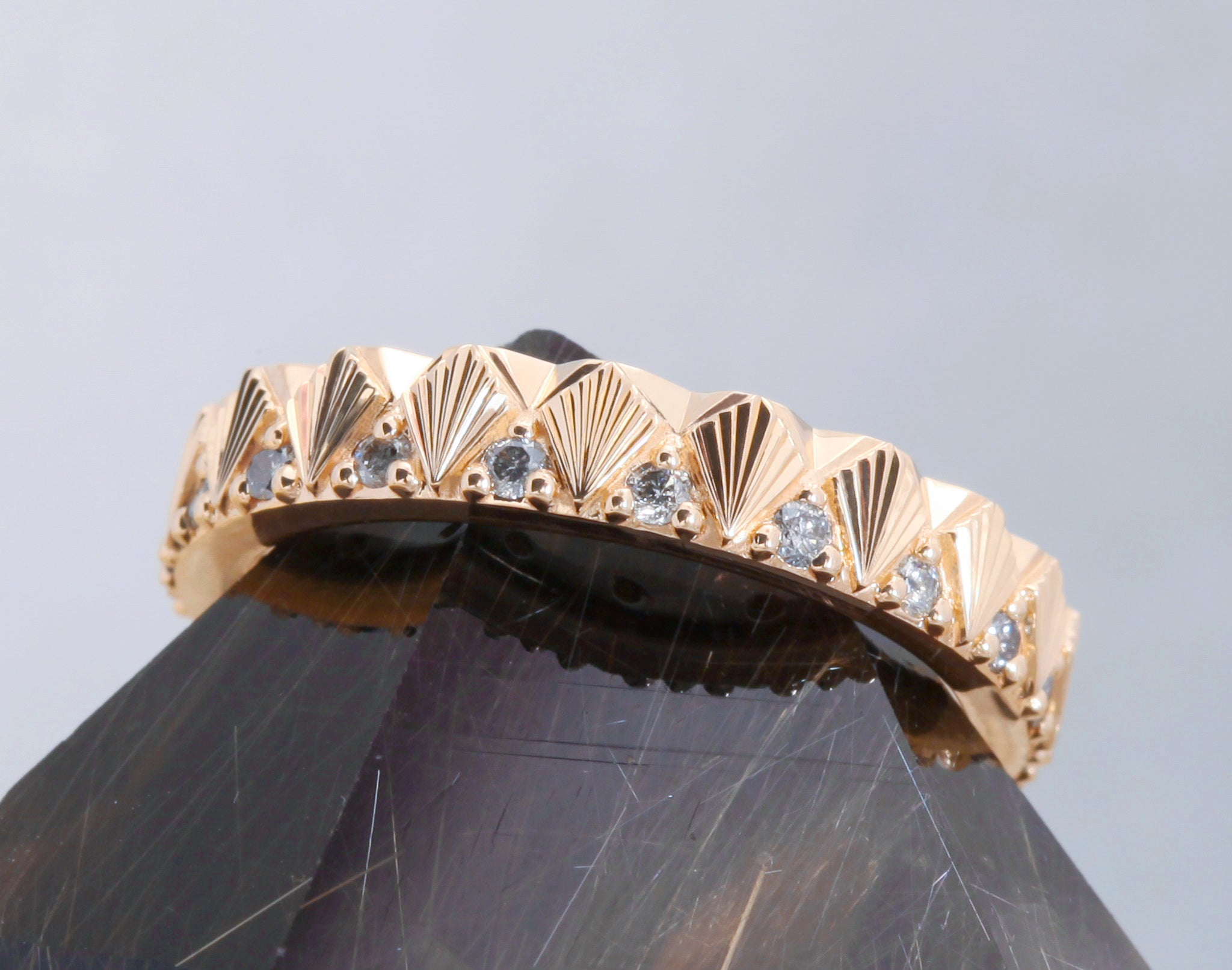 Not all rings begin as heirlooms, but we have a feeling this hand engraved Plume band has achieved heirloom status from inception. This 4mm band features our signature hand engraved starburst accents in an eternity band style with large beveled cutouts that bring balance to the ring's pattern. This ring band is only 4mm but special wider versions may be made upon request.