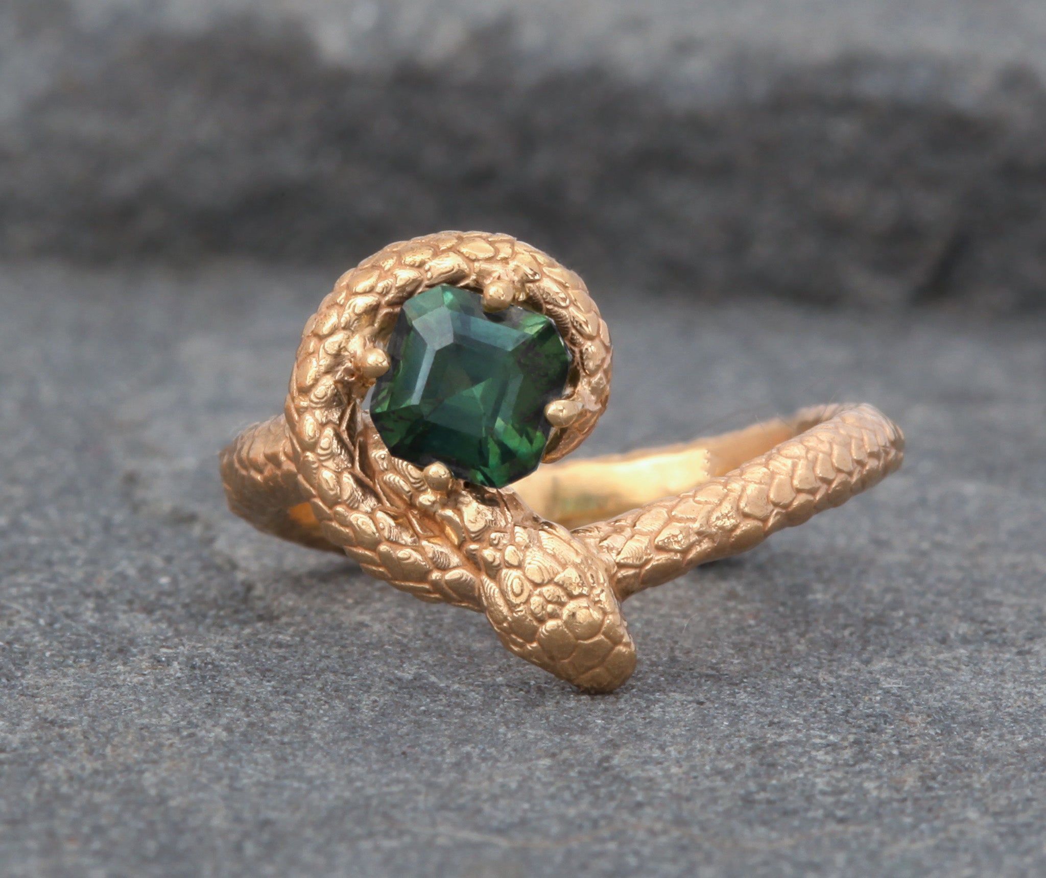 Inspired by the natural world, this ring band features a snake that wraps around the entirety of the piece and coils on the crest around a deep green 5mm asscher cut Australian sapphire. The 14k yellow gold compliments both the captivating stone and cast serpent band which has a vintage polished finish and measures just over 2mm.
