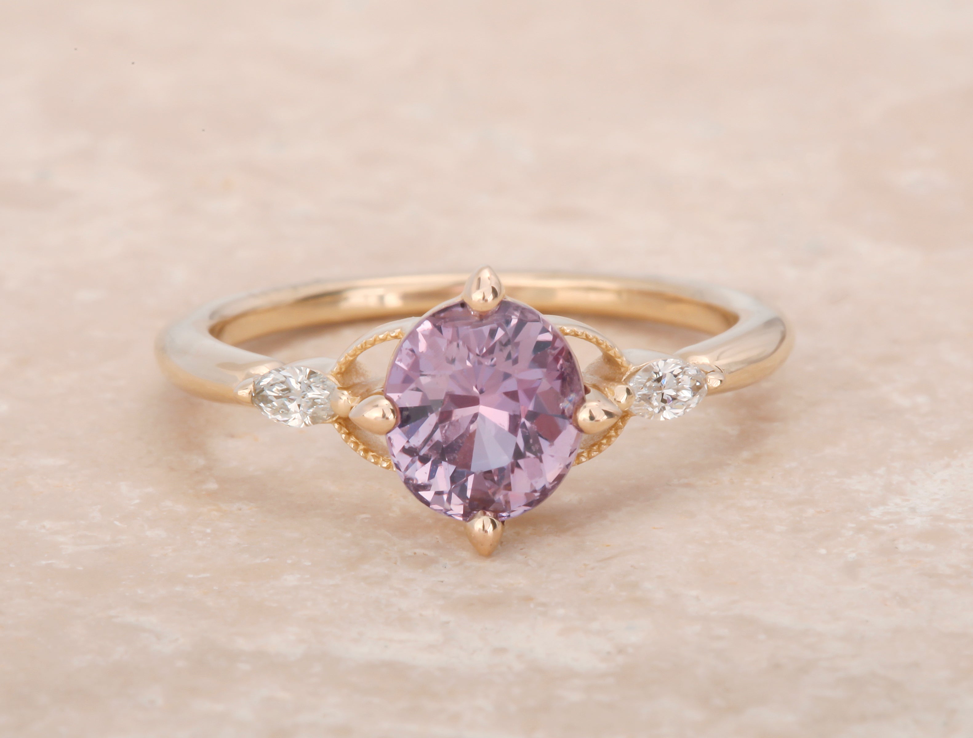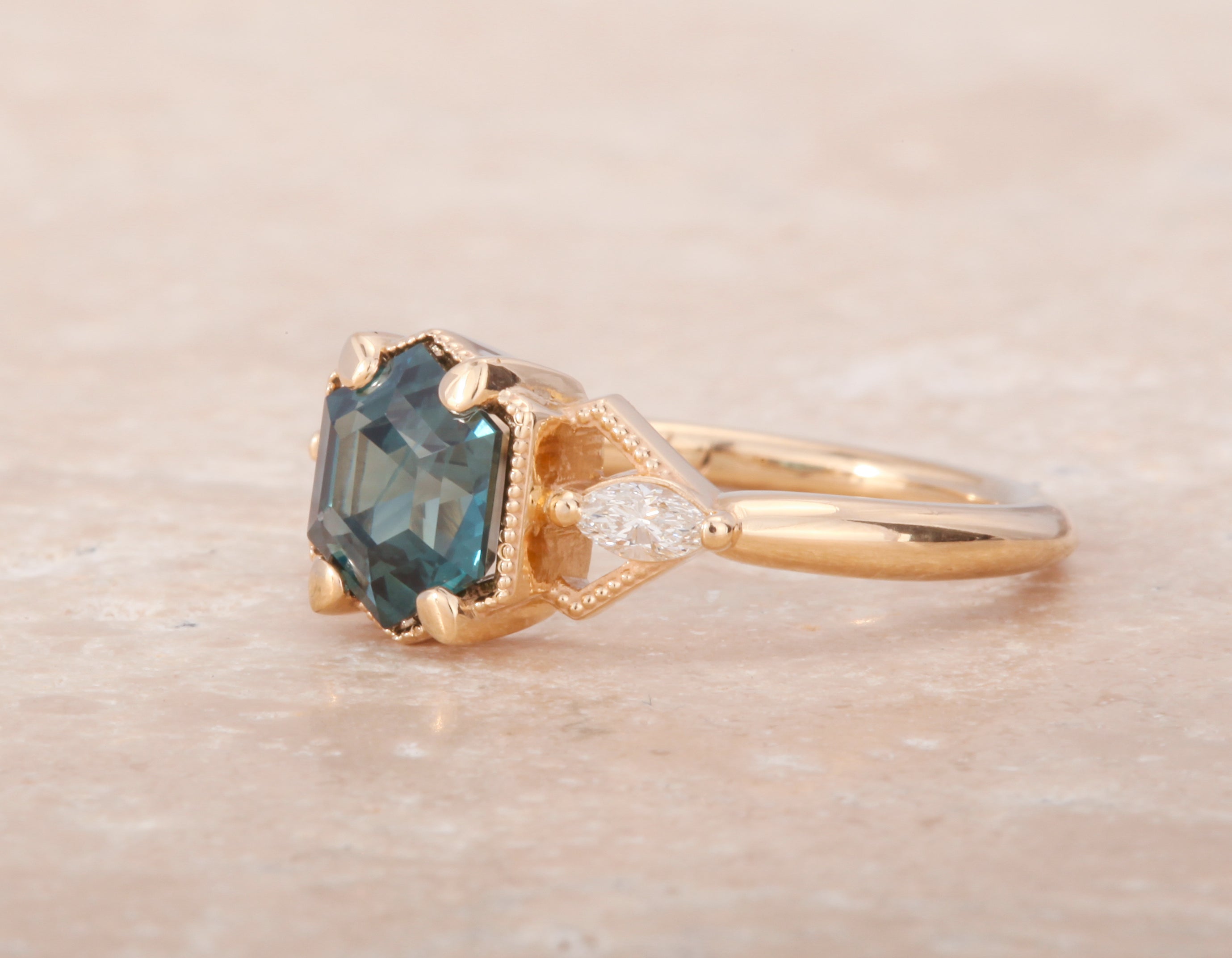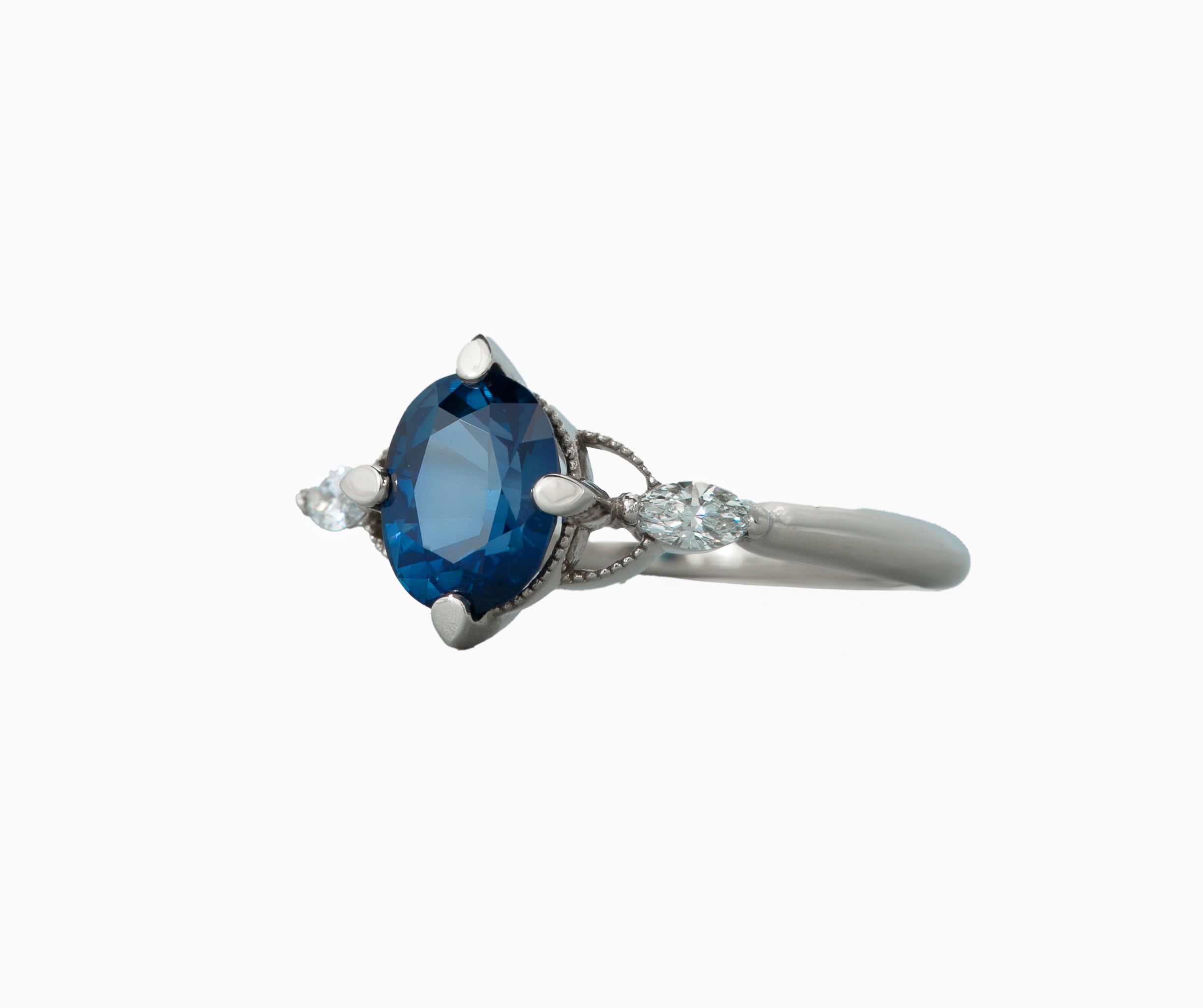 In the Datura ring, your gem of choice is suspended in a spacious setting with delicate design elements allowing the center stone to appear to almost float, stealing the show instantly. A pair of marquise diamonds support the center as it transitions into the band. This design can be made with curved or geometric lines, please specify in the notes which you would prefer, or feel free to email us and ask for our opinion on which would look best with your chosen stone.