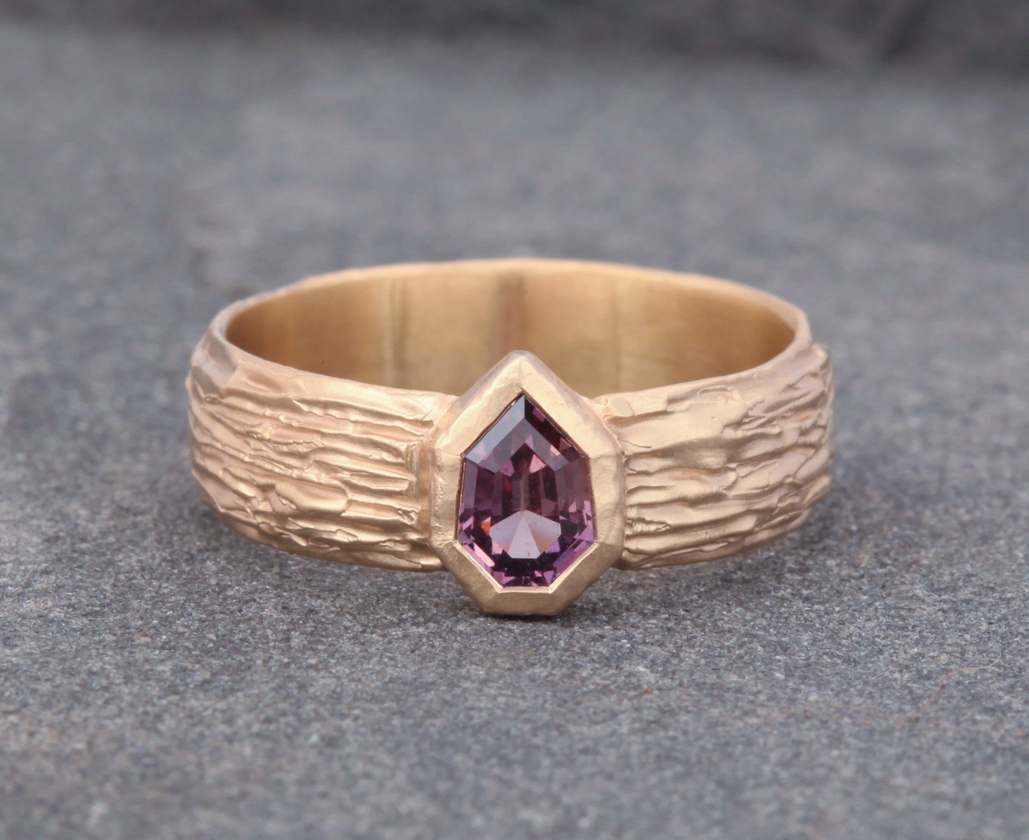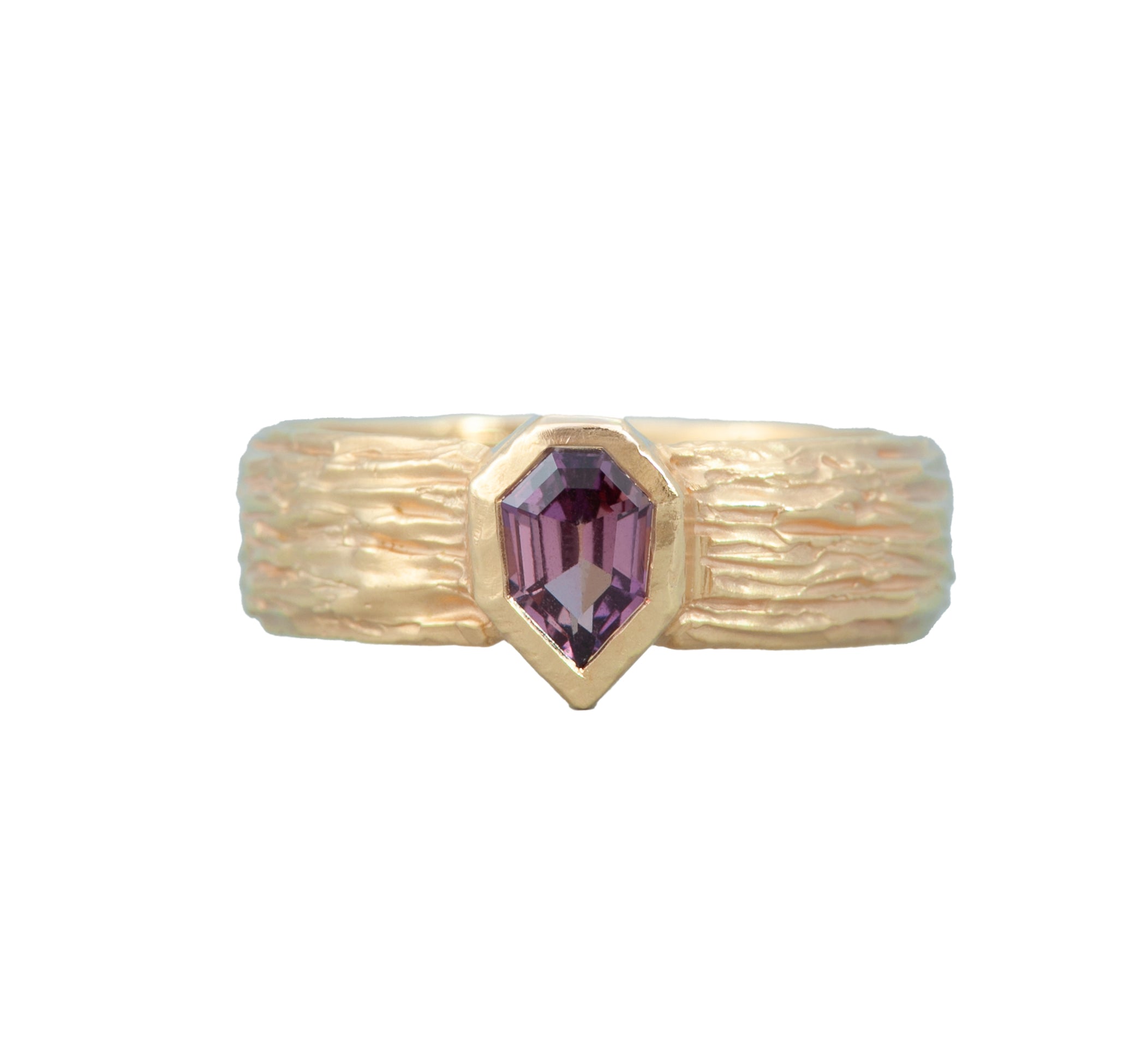 This stunning ring band is crafted and hand-carved with our signature "Elder" texture, highlighting the dimensional qualities of the metal in which it is cast. This wax-carved texture balances the refinement of fine jewelry and the inspiration of natural form, individual and unique each time. The stone is set in a rough textured bezel setting and this band is 6mm, but can be done in a variety of widths, please contact us to see about options.