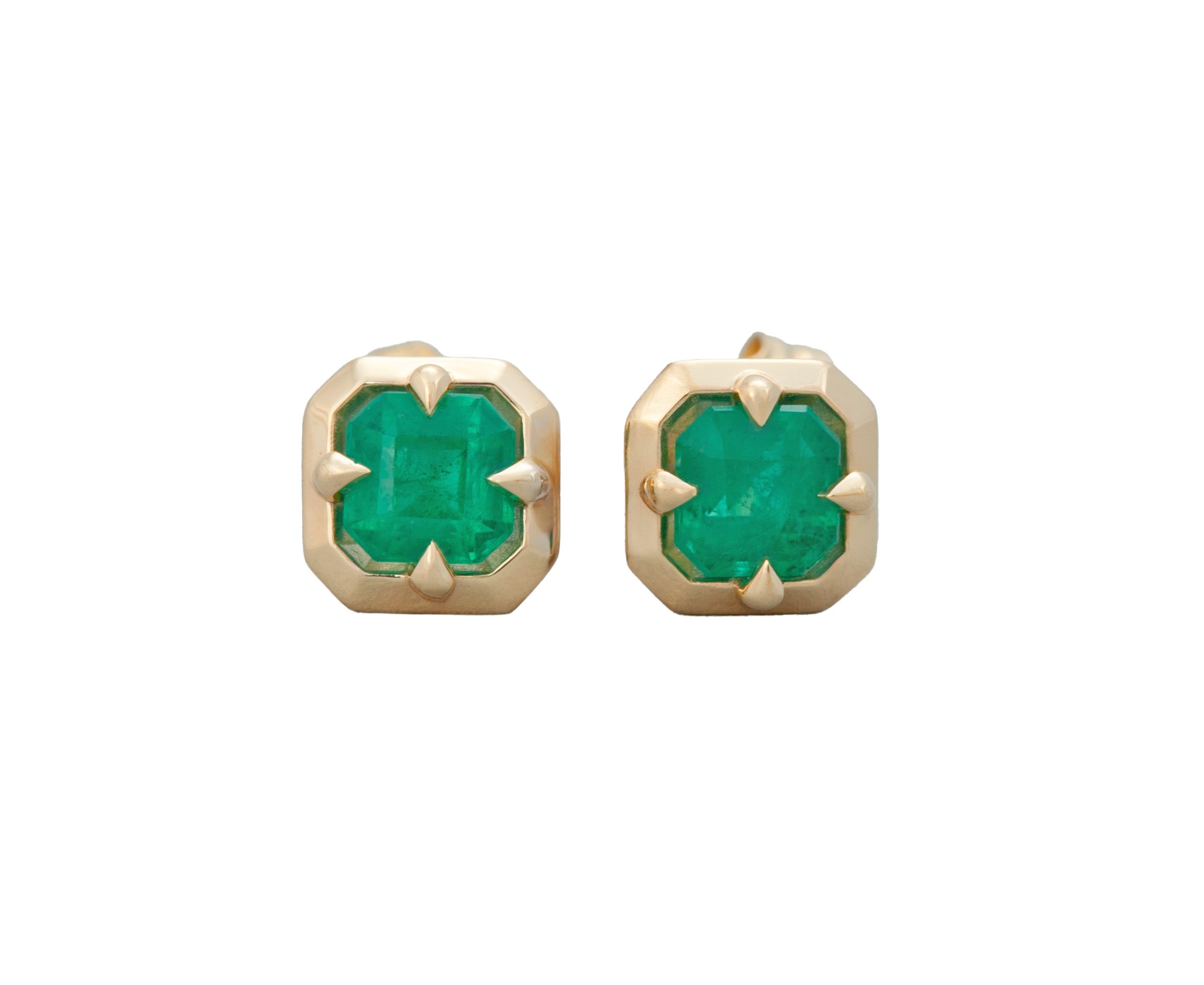 Pair of Zambian emeralds in our 14k Yellow Gold Audrey setting. The emeralds themselves are 4 x 4mm and weight 0.61cts.