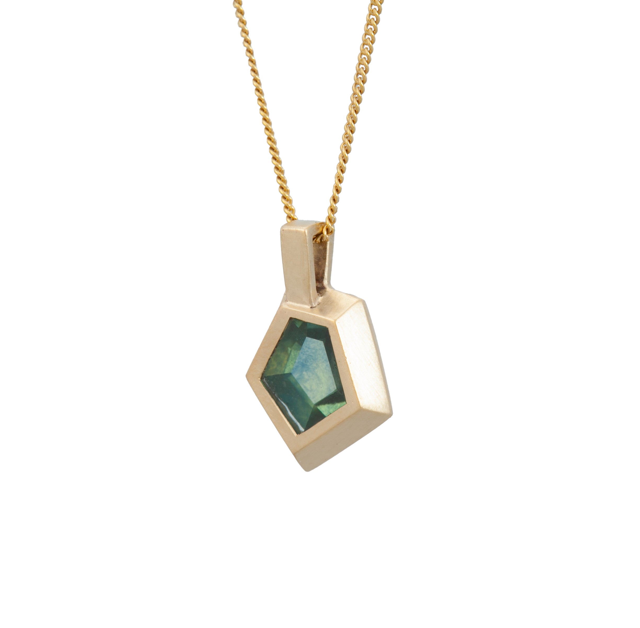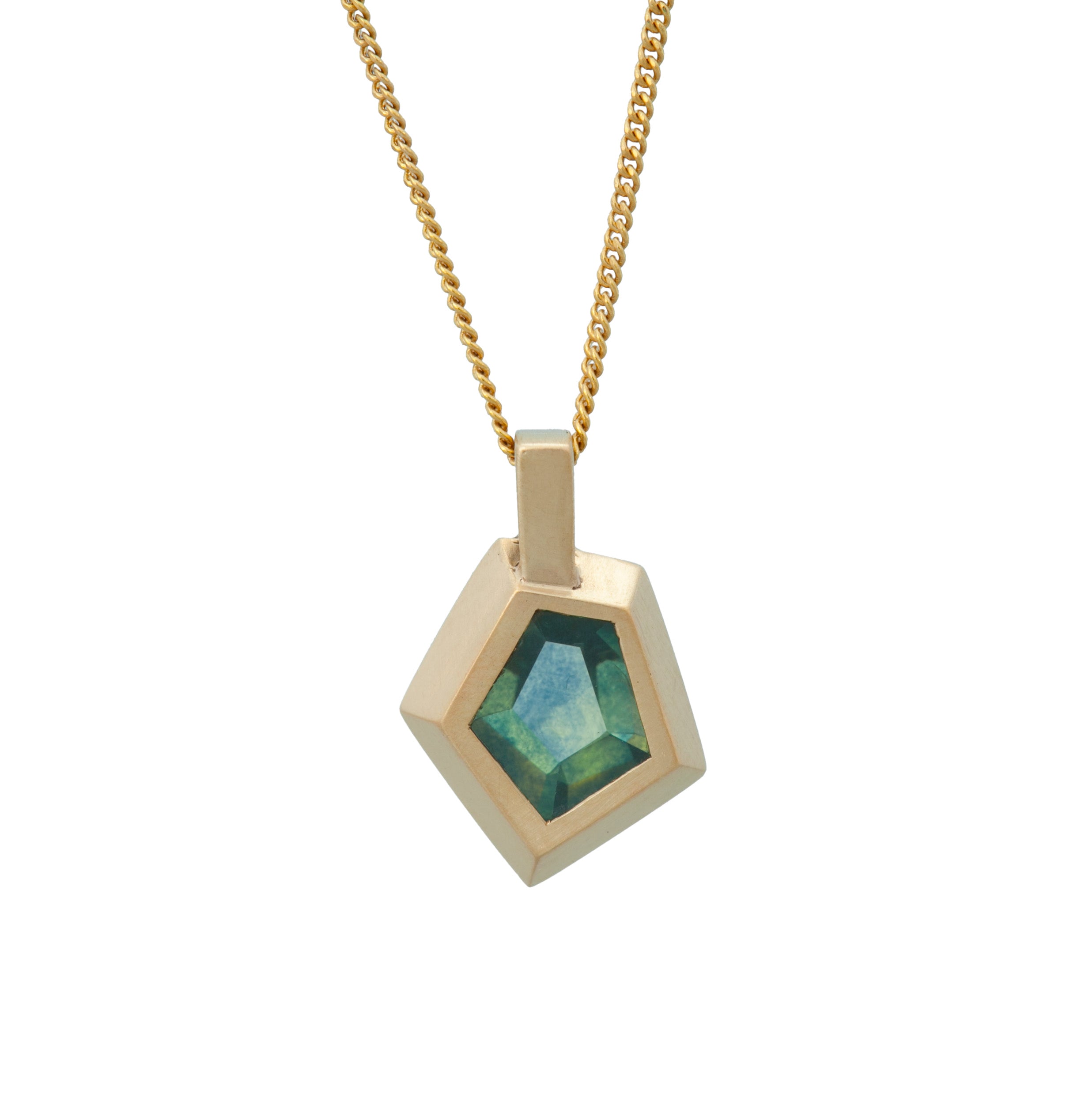 This geometric portal consists of a 1.0ct portrait cut Montana Sapphire from Rock Creek set in a 14K yellow gold pendant with a satin finish. This pendant was carved to match the facets of the stone. This would make a funky addition to your everyday jewelry rotation.