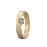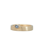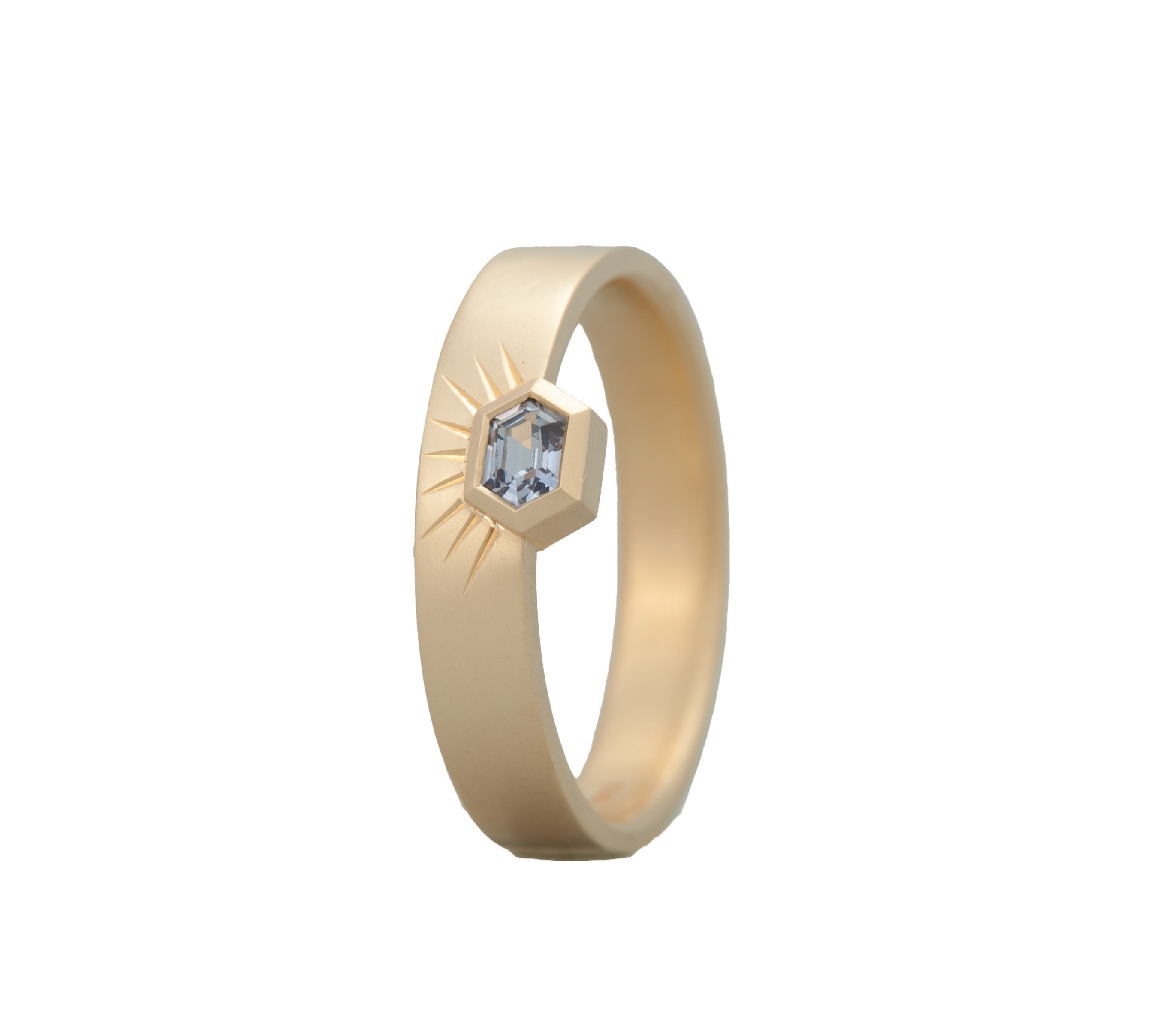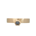 An engraved twist on our usual 4mm Riley band. Features a grey hexagon spinel and 14K yellow gold satin finish.