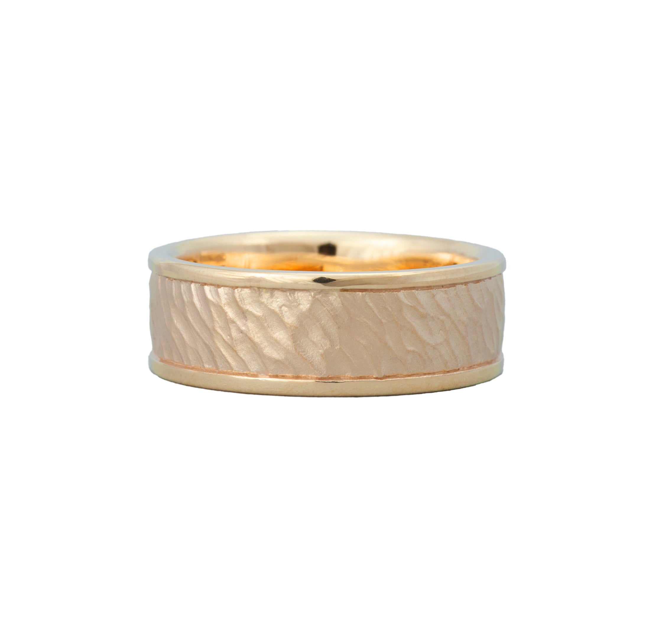 A heavy gold hitter! A mixed textured and polished finish balance and elevate this wax carved and cast 14K yellow gold band.