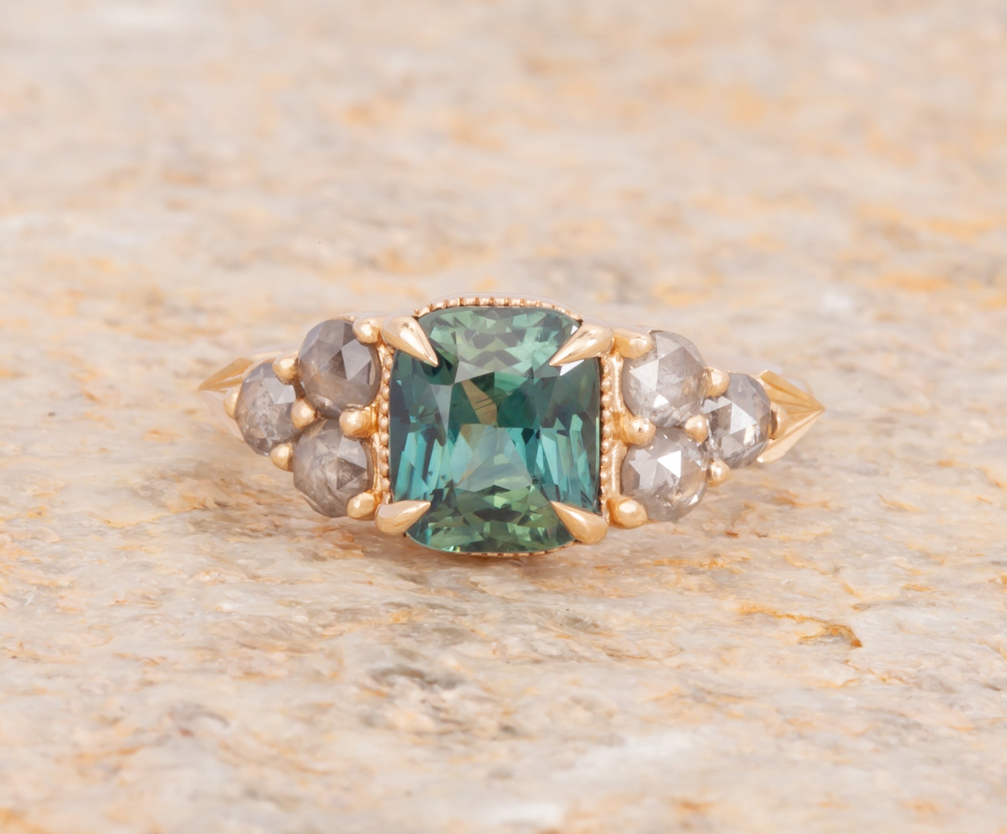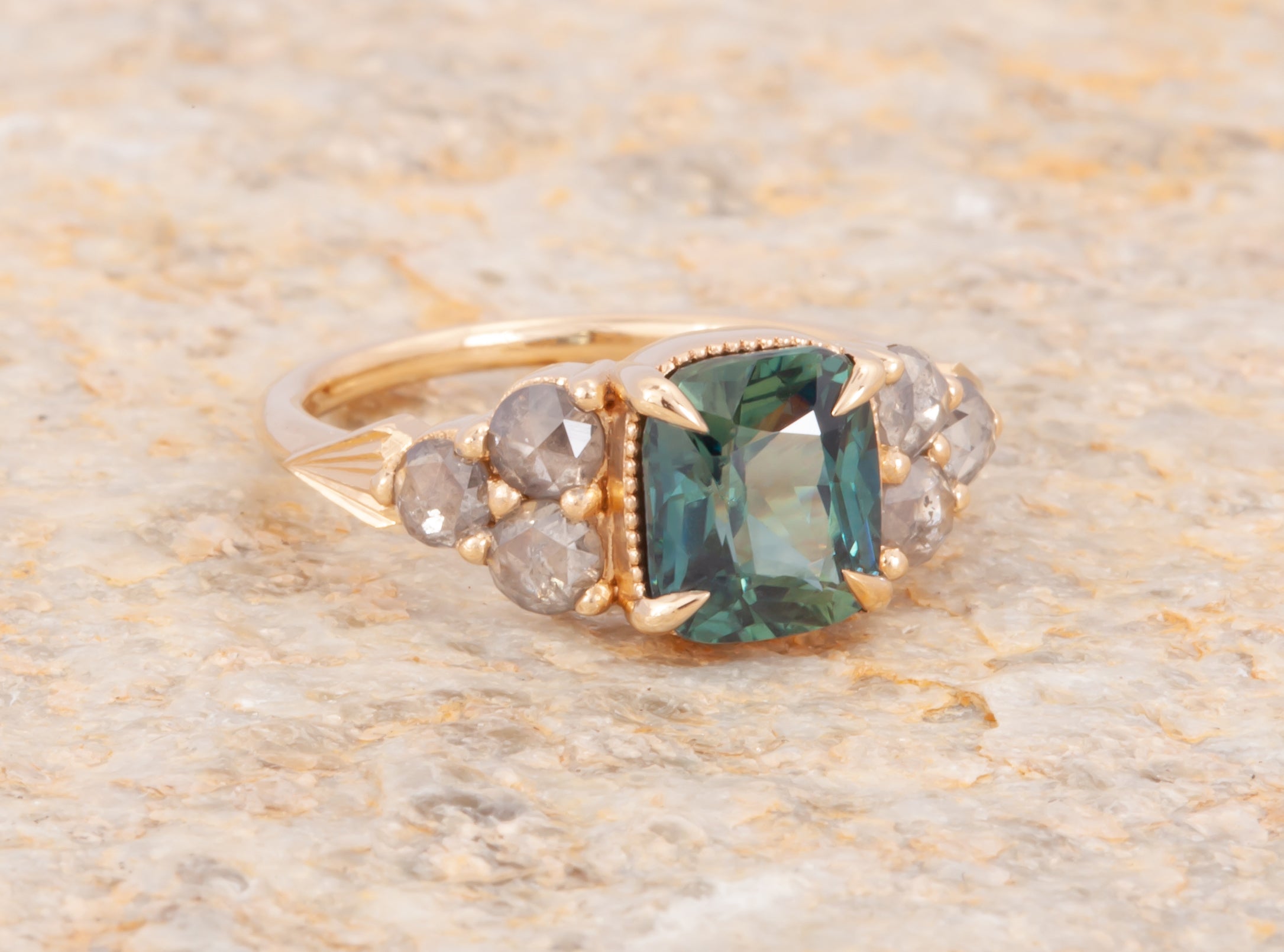 2.25ct Teal Parti-Sapphire set in 14k yellow gold with light grey rosecut diamond accents.