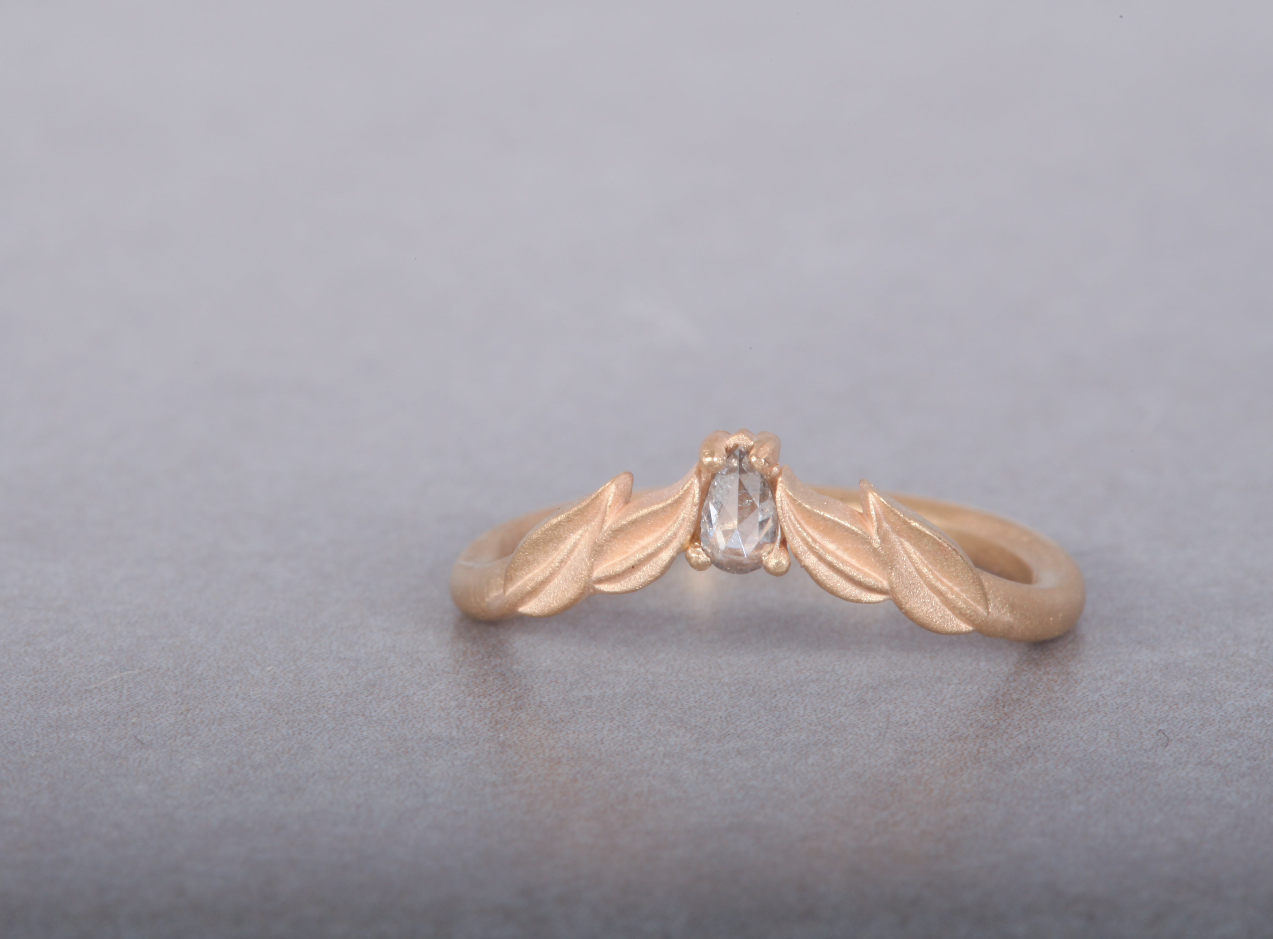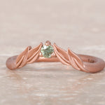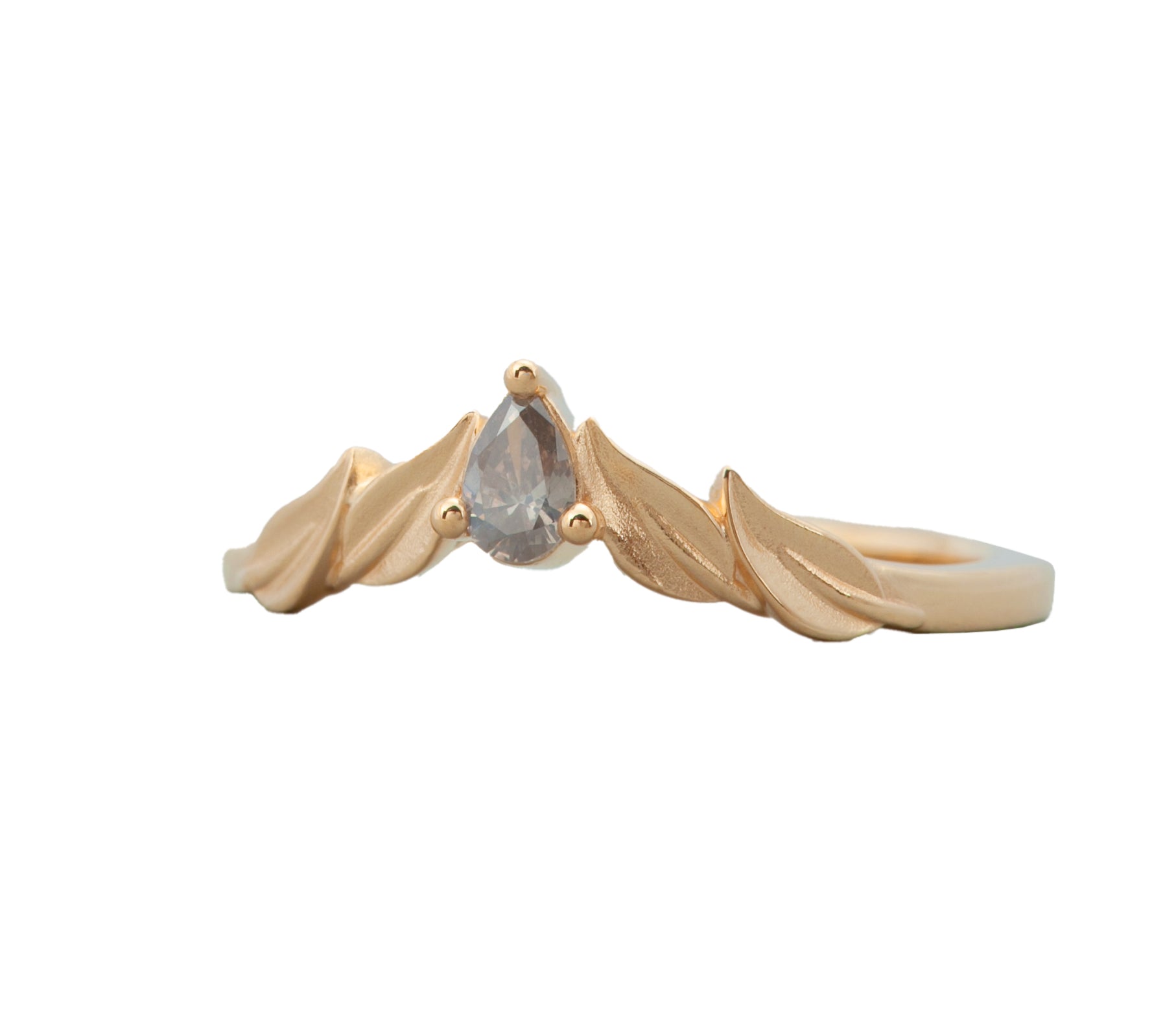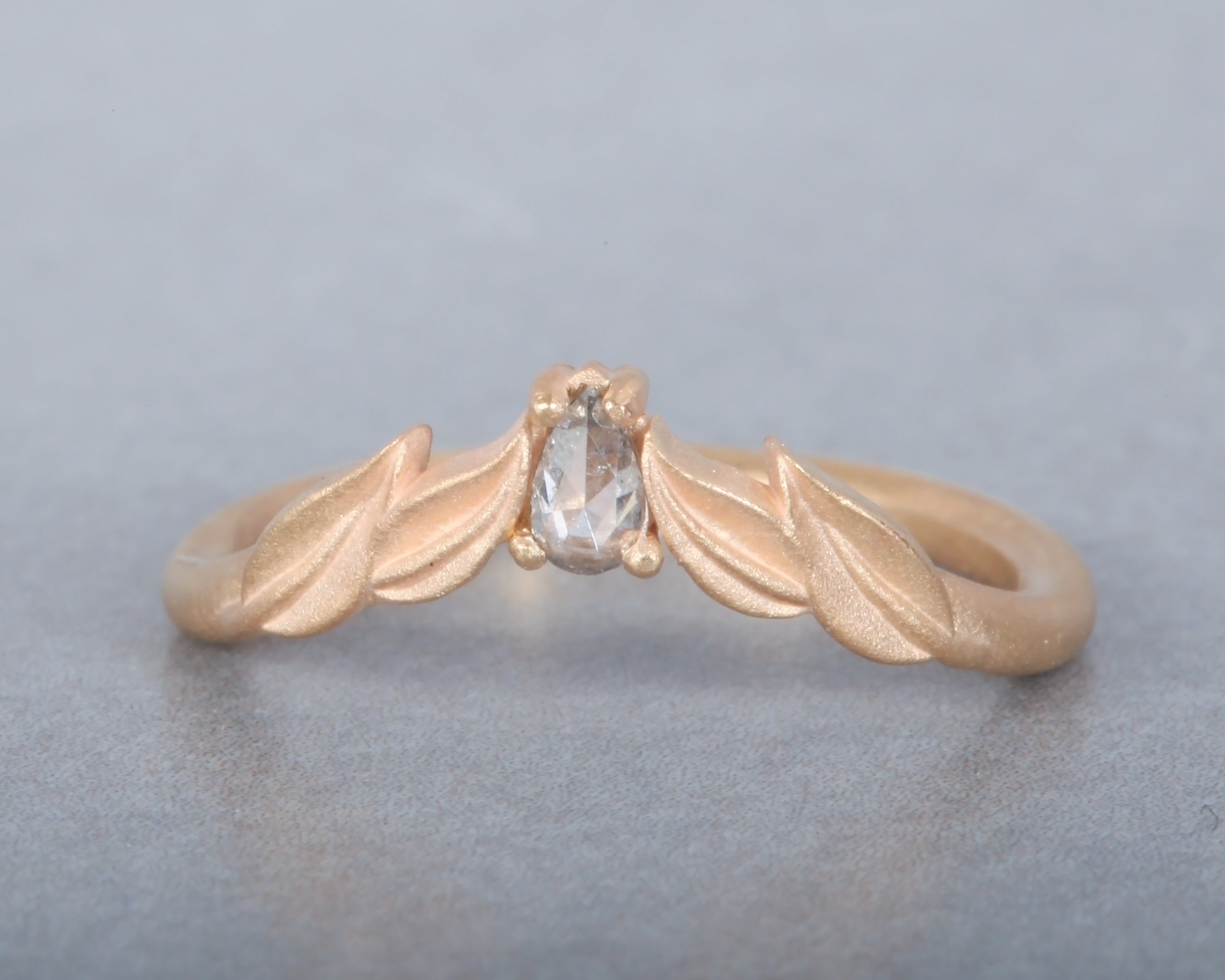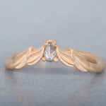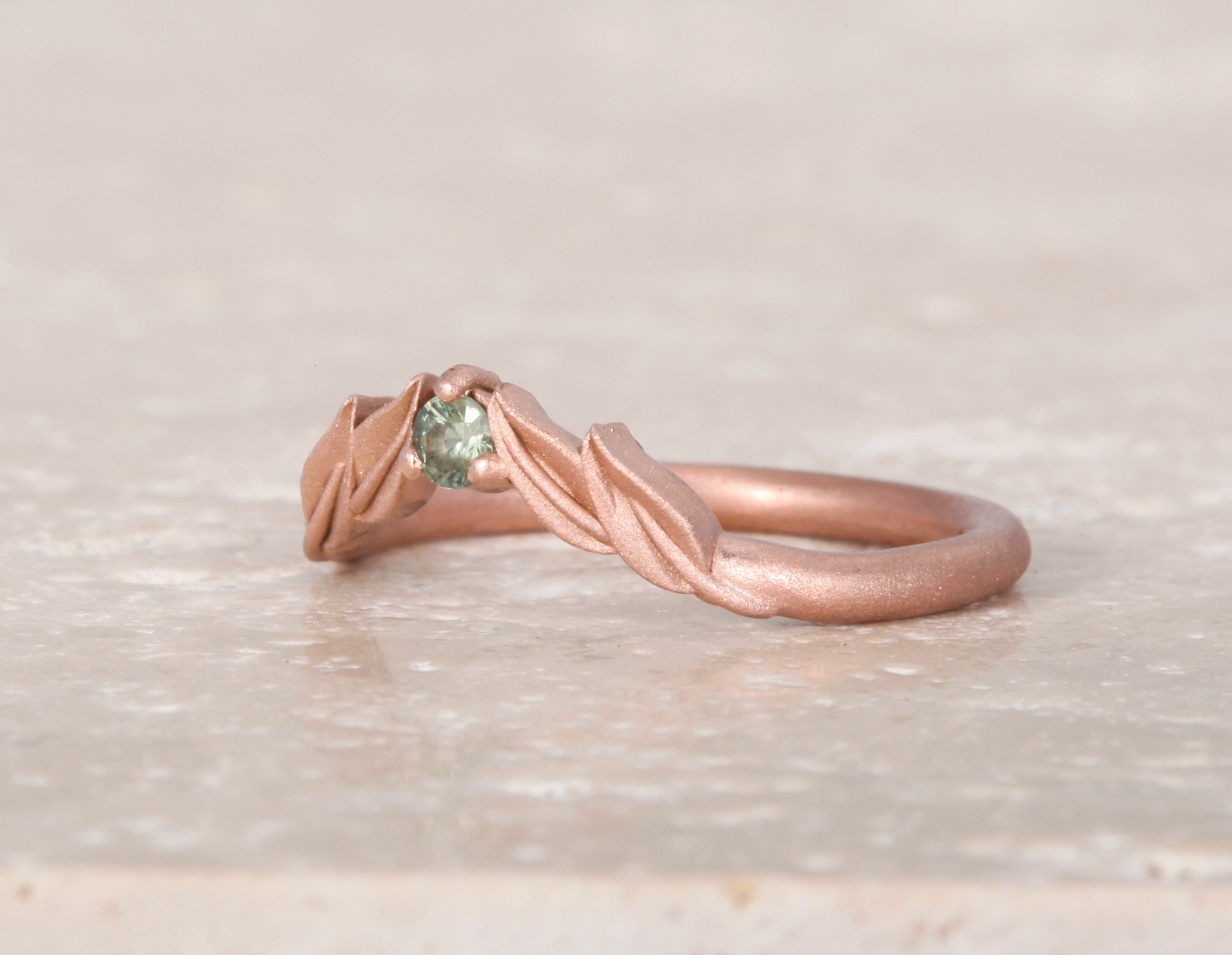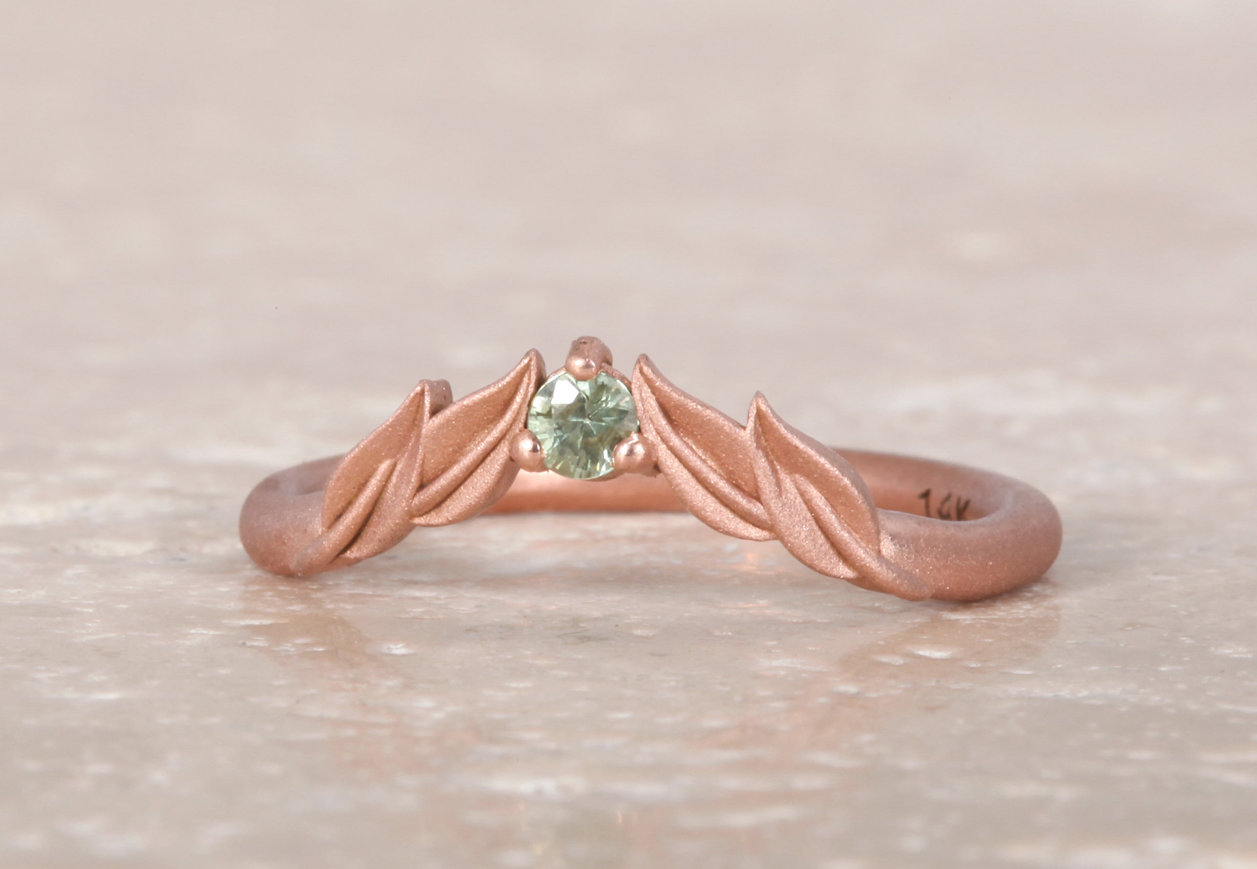This matching band can be the perfect way to elevate your ring with an archway of leaves and a stone of your choice at the center. We can customize this design to fit most of our ring settings, while also giving you the freedom to choose from a variety of stone shapes, colors and sizes to your liking. Please contact us for pricing and information on stone variations. For example, the price includes most sapphires that would fit into this matching band, but if you would rather have a diamond it may increase the price a bit.