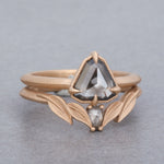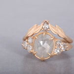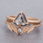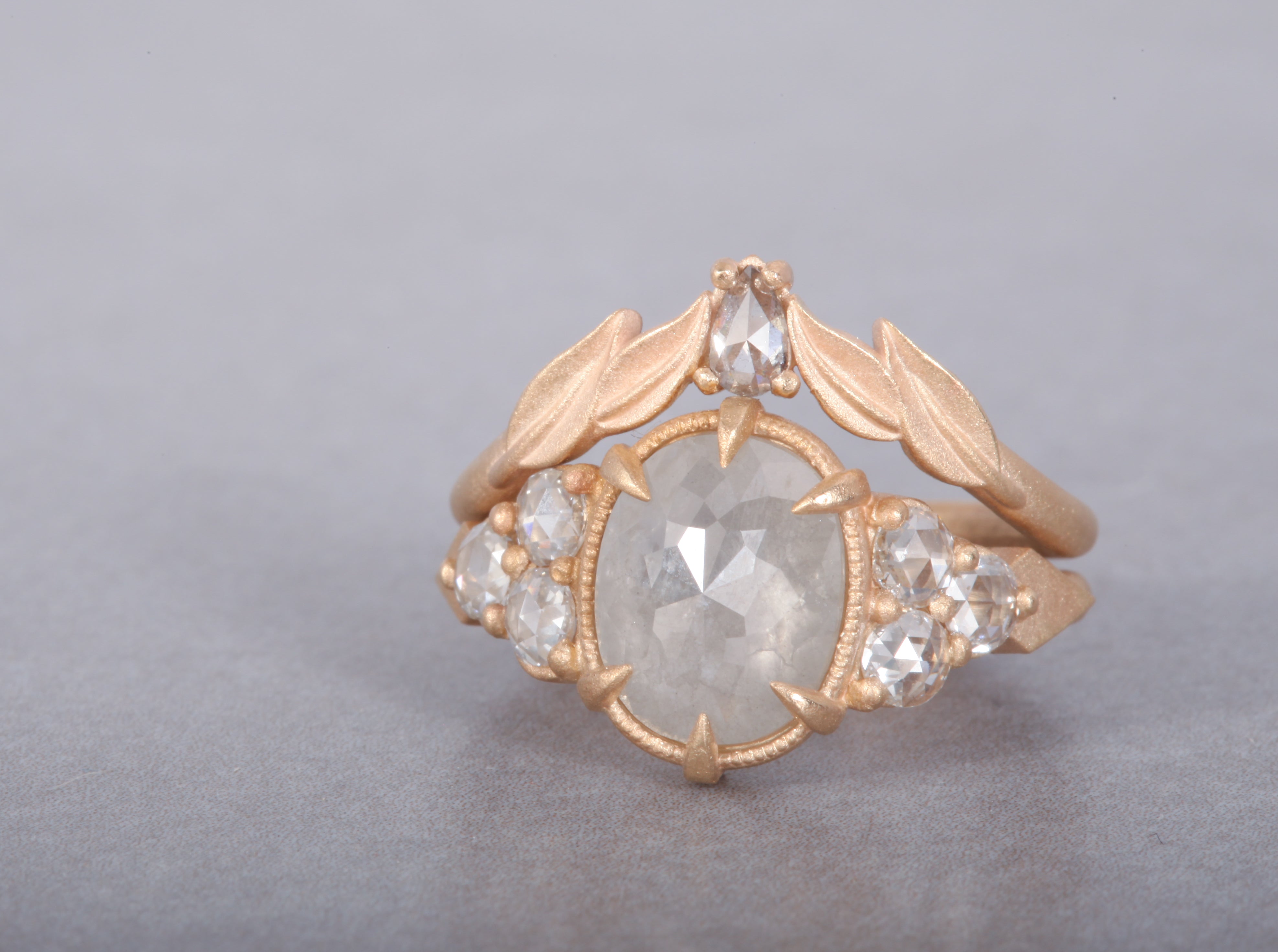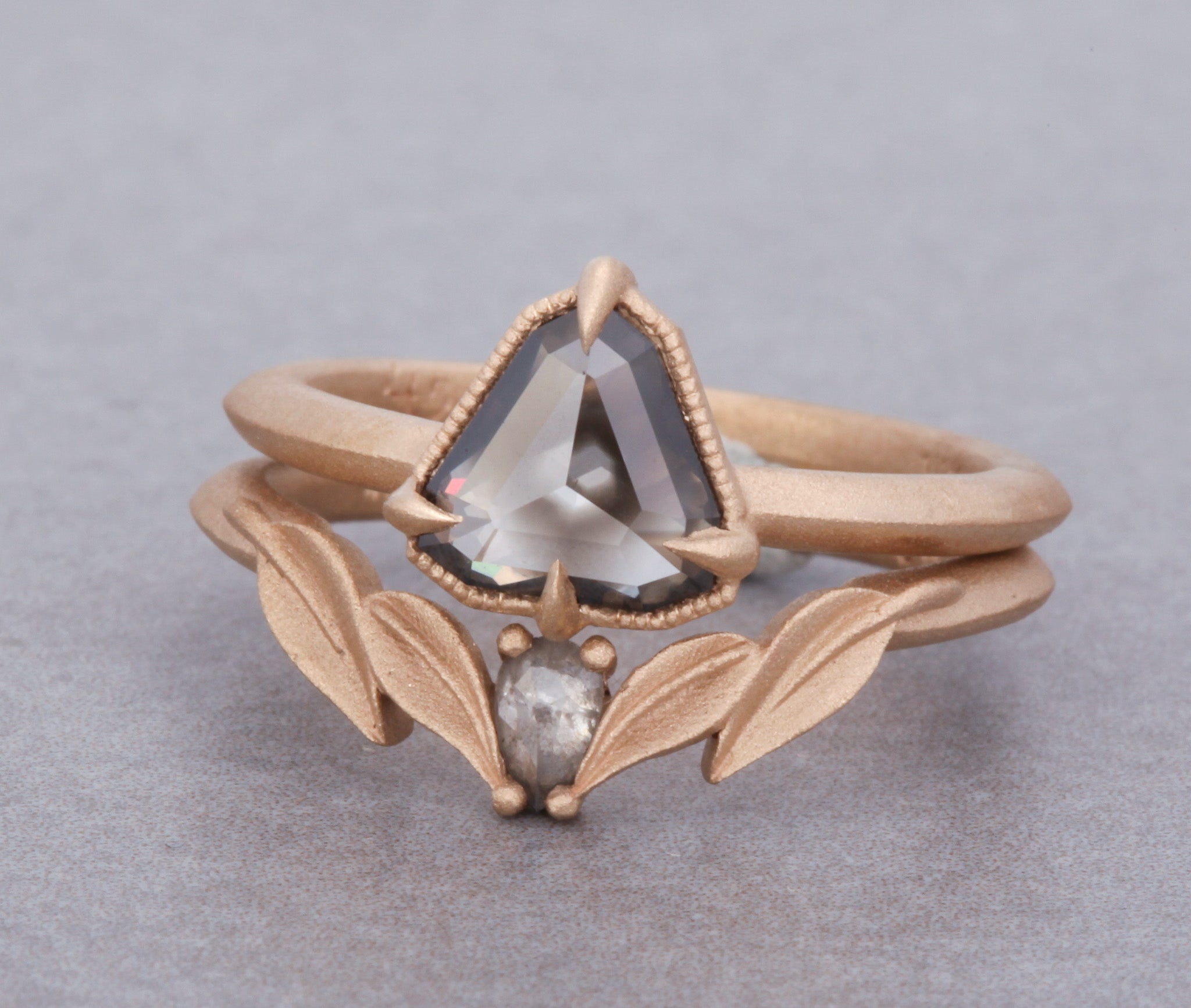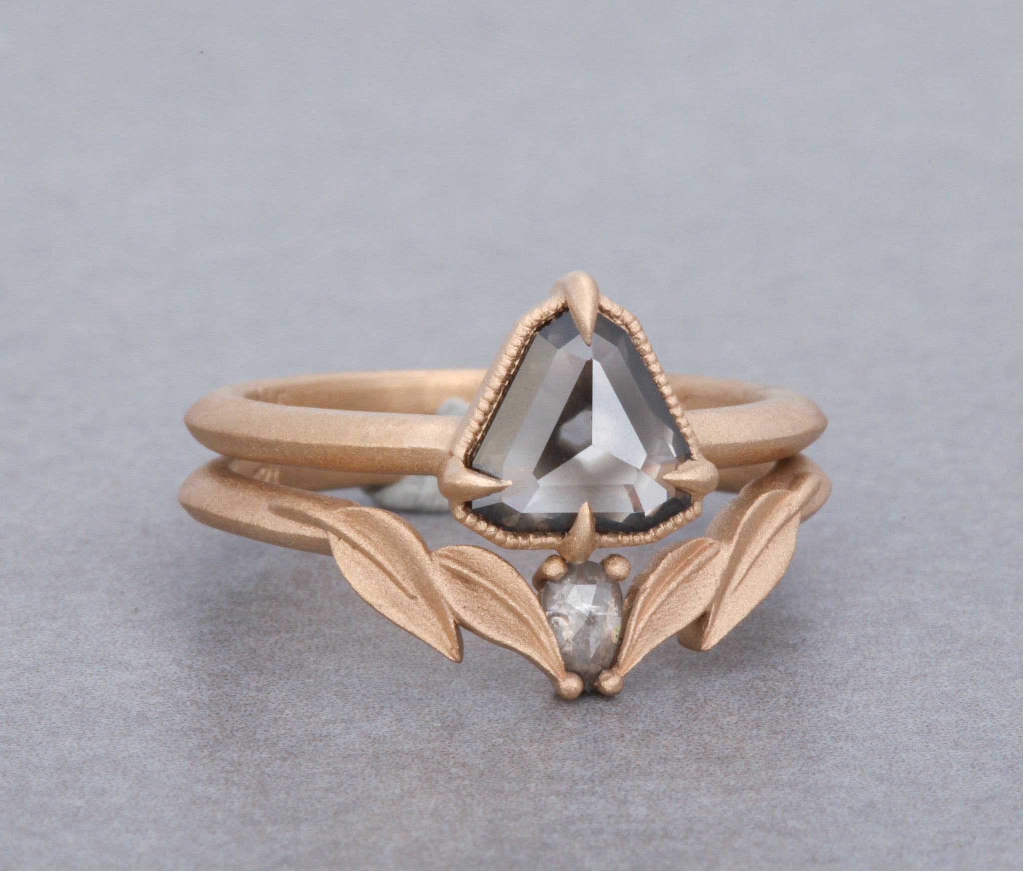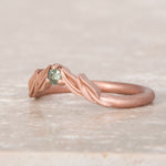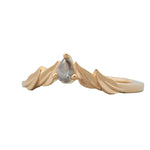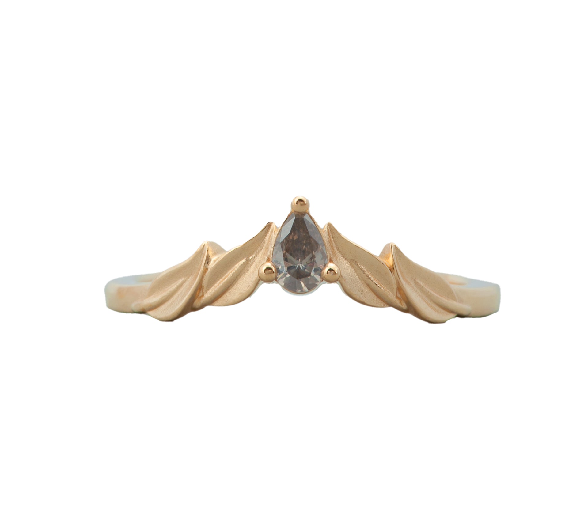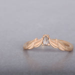 This matching band can be the perfect way to elevate your ring with an archway of leaves and a stone of your choice at the center. We can customize this design to fit most of our ring settings, while also giving you the freedom to choose from a variety of stone shapes, colors and sizes to your liking. Please contact us for pricing and information on stone variations. For example, the price includes most sapphires that would fit into this matching band, but if you would rather have a diamond it may increase the price a bit.