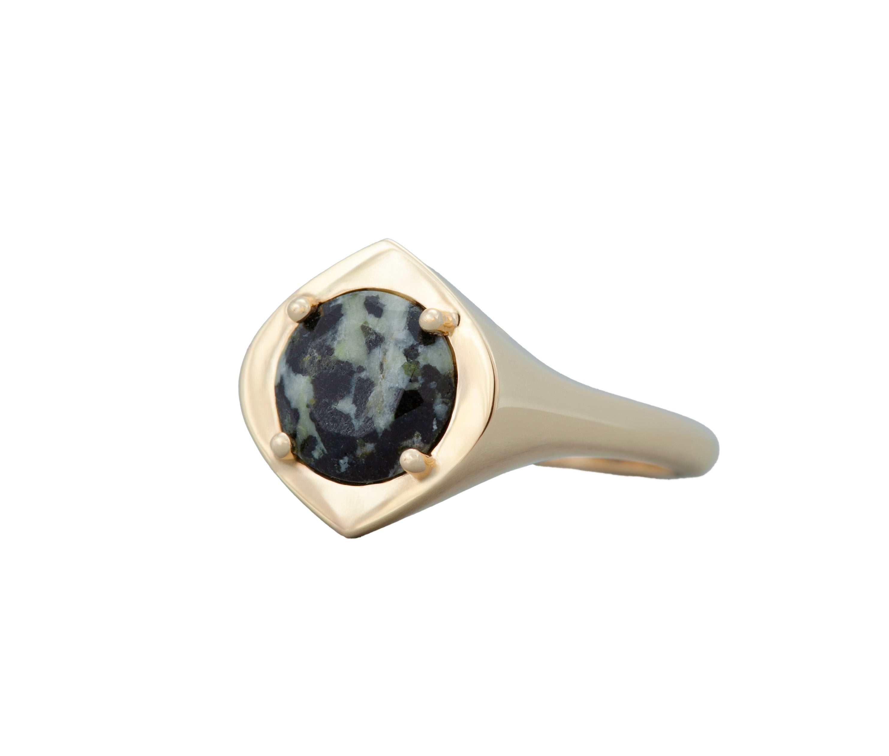 A daily reminder of long summer days stretched out on a granite boulder at the Yuba. 14K yellow gold marquise shaped signet ring featuring a brilliant cut granite cut in-house in collaboration with Leora Coronel. Carry a piece of home with you.