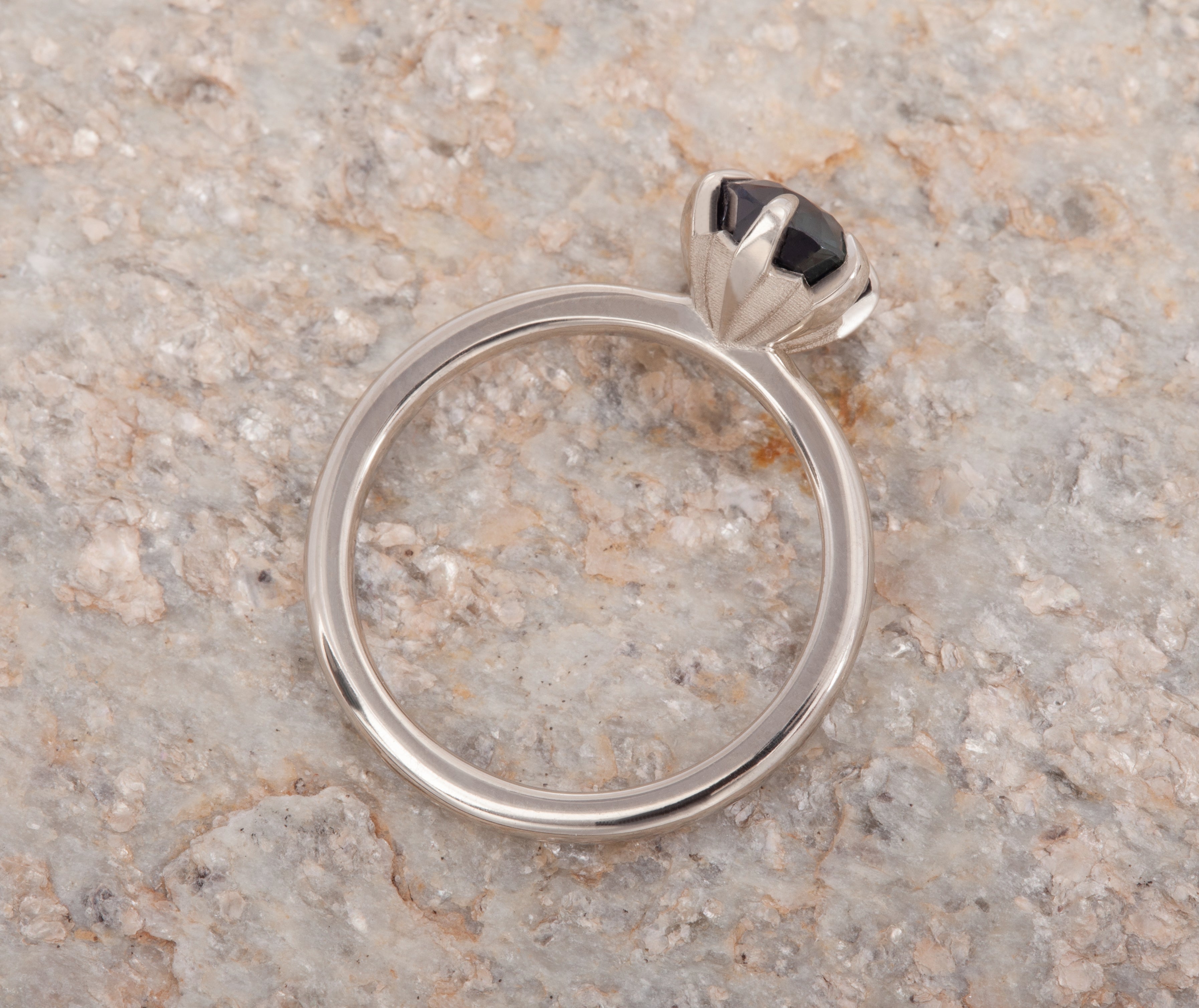 We set our center stones as low as possible in most of our designs, none of these ludicrous sky-high settings that essentially render your left hand as a decorative object only. We can easily do a satin finish or rough/rustic prong setting style upon request. We can even alter the amount of prongs adding more or using less. Please get in touch with any requests!