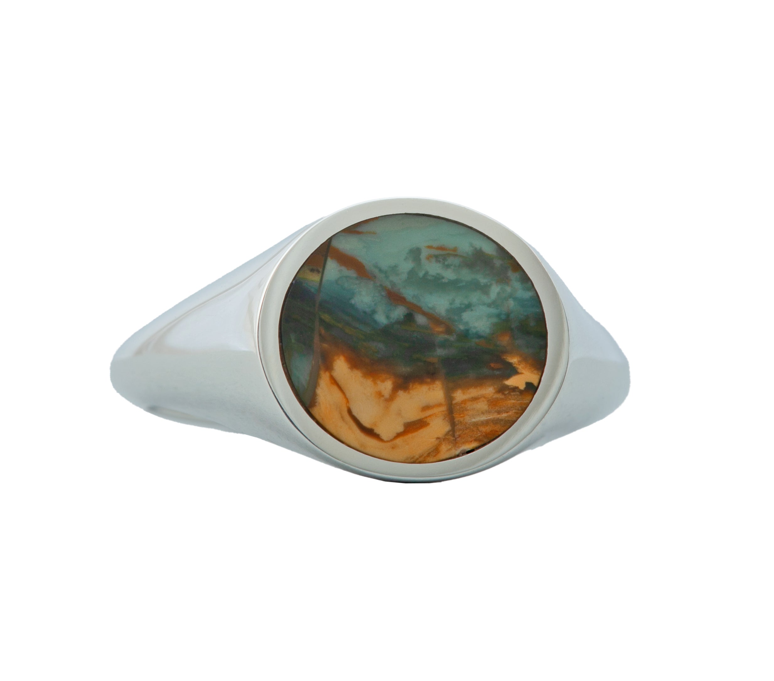 Our vertical oval signet featuring morrisonite from Oregon, cut in-house and inlaid in sterling silver. Morrisonite is often called "The King of Jaspers" known for its scenic patterning that reflect the dreamy composition of Owyhee Canyon.