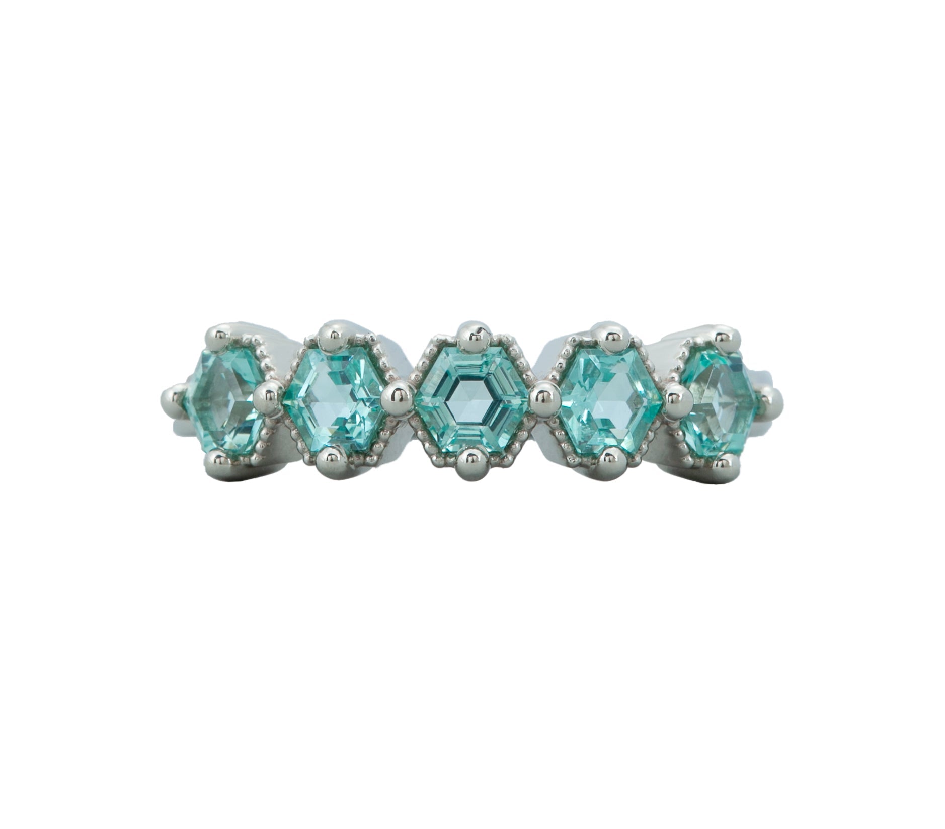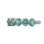 Our beloved neon beryl once again in a 5 stone Petra Ring, this time in 14k white gold. Approximately 1.5cts of neon beryl in this band. Stacks well with others.
