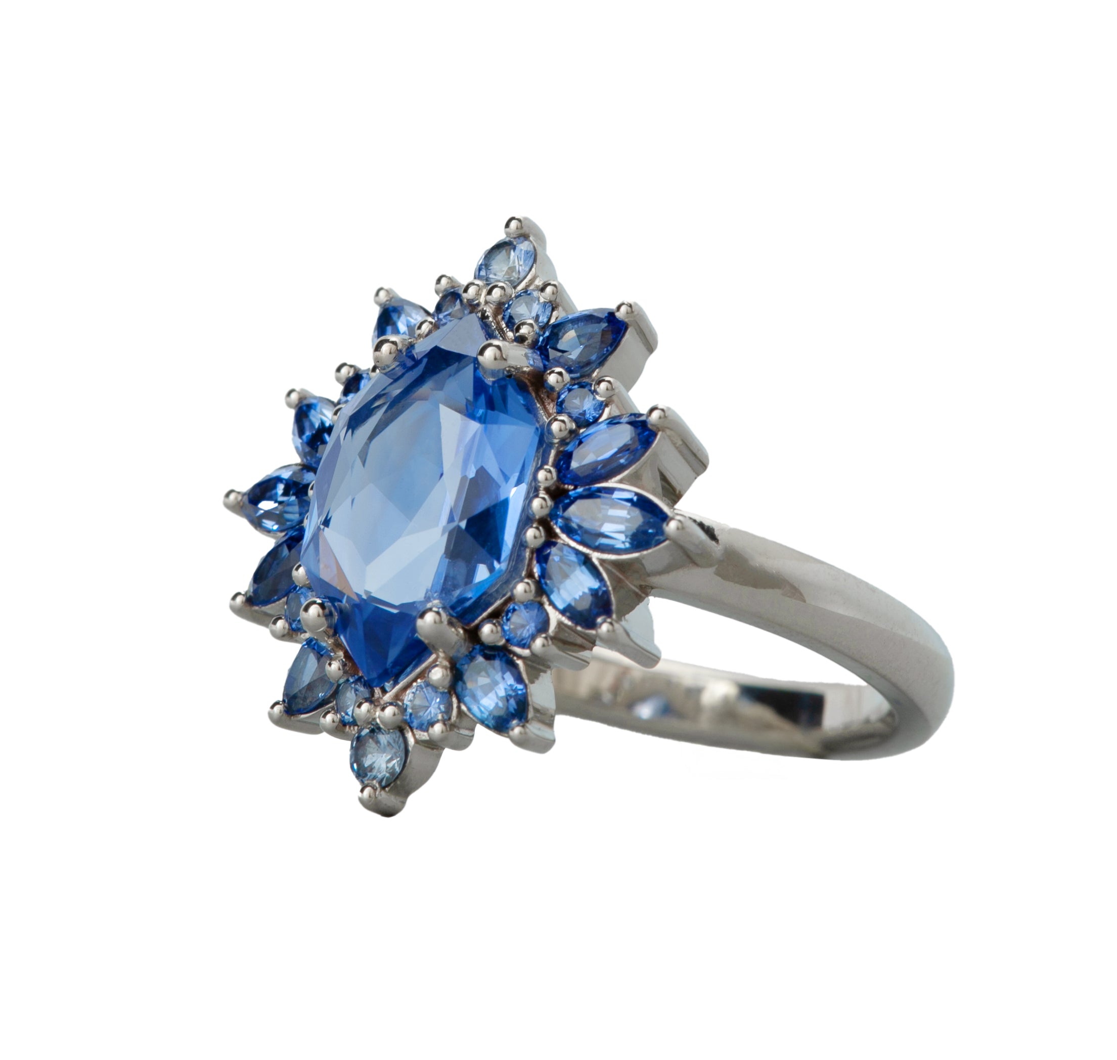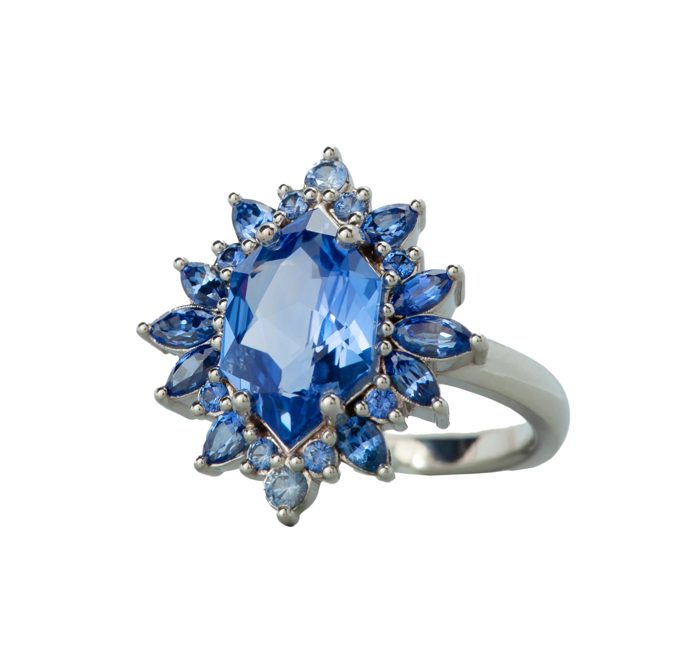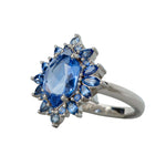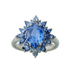Crazy OOAK blue sapphire statement piece with a 2.54ct blue sapphire surrounded by an array of gradient blue rounds, marquise, and pear sapphires totaling 0.89ct in 14K white gold. The low profile of this ring is perfect to wear as an everyday engagement ring.
