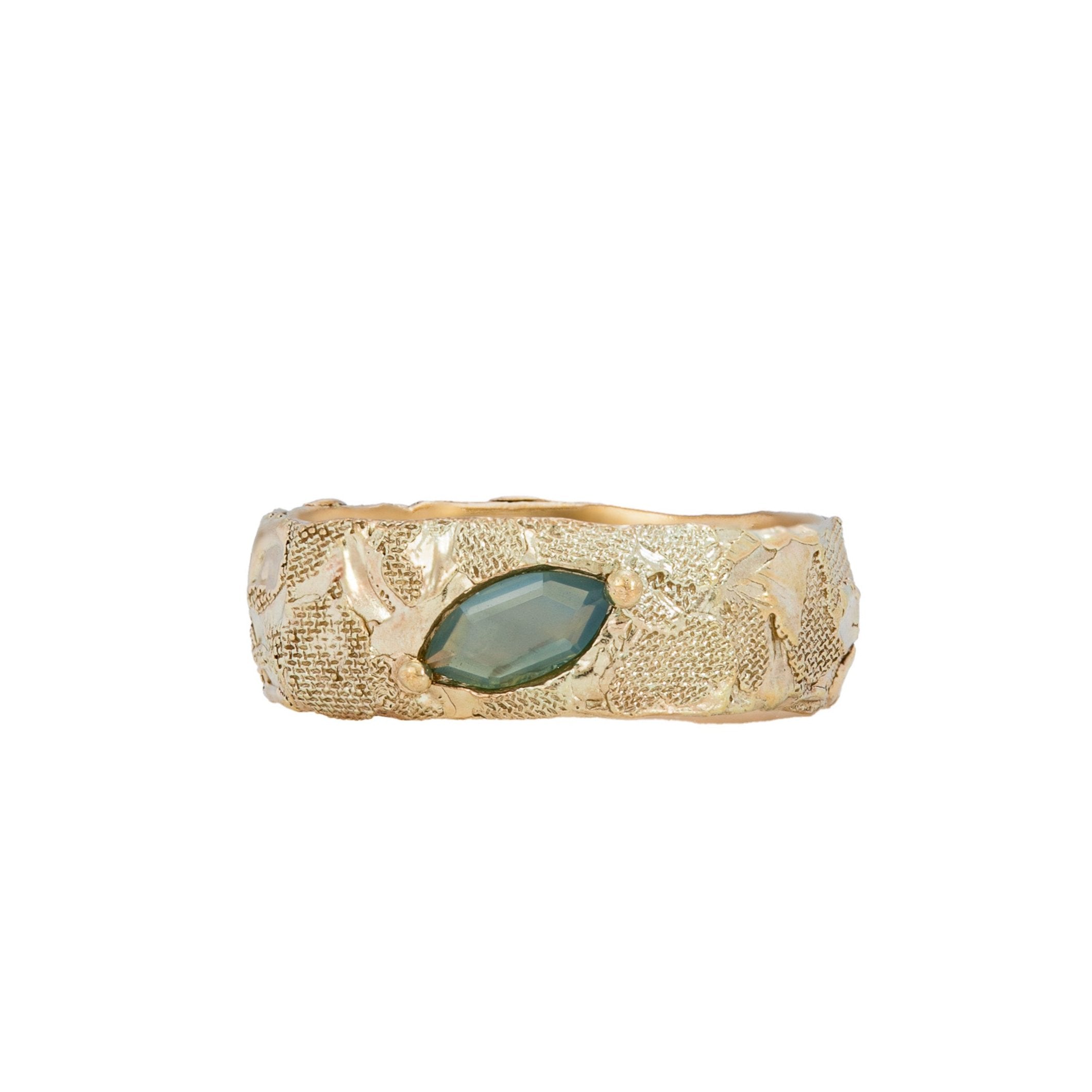 The band is 14k yellow gold and the width is about 6.5 mm wide, and 1.4 mm thick. There is an elongated hexagon Australian sapphire set within the band to complete this captivating design. It is a size 8.5.