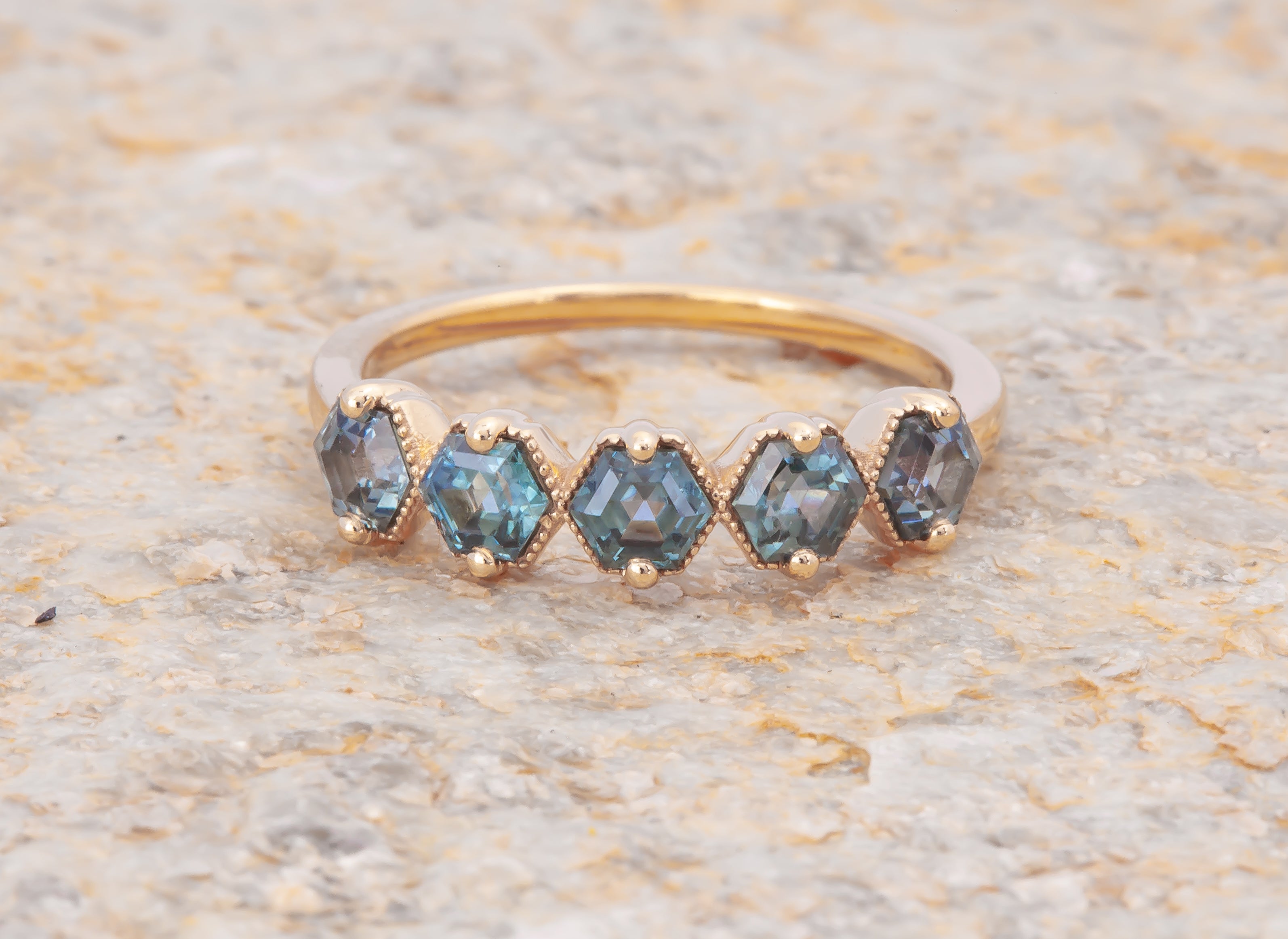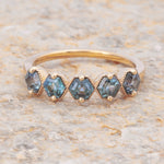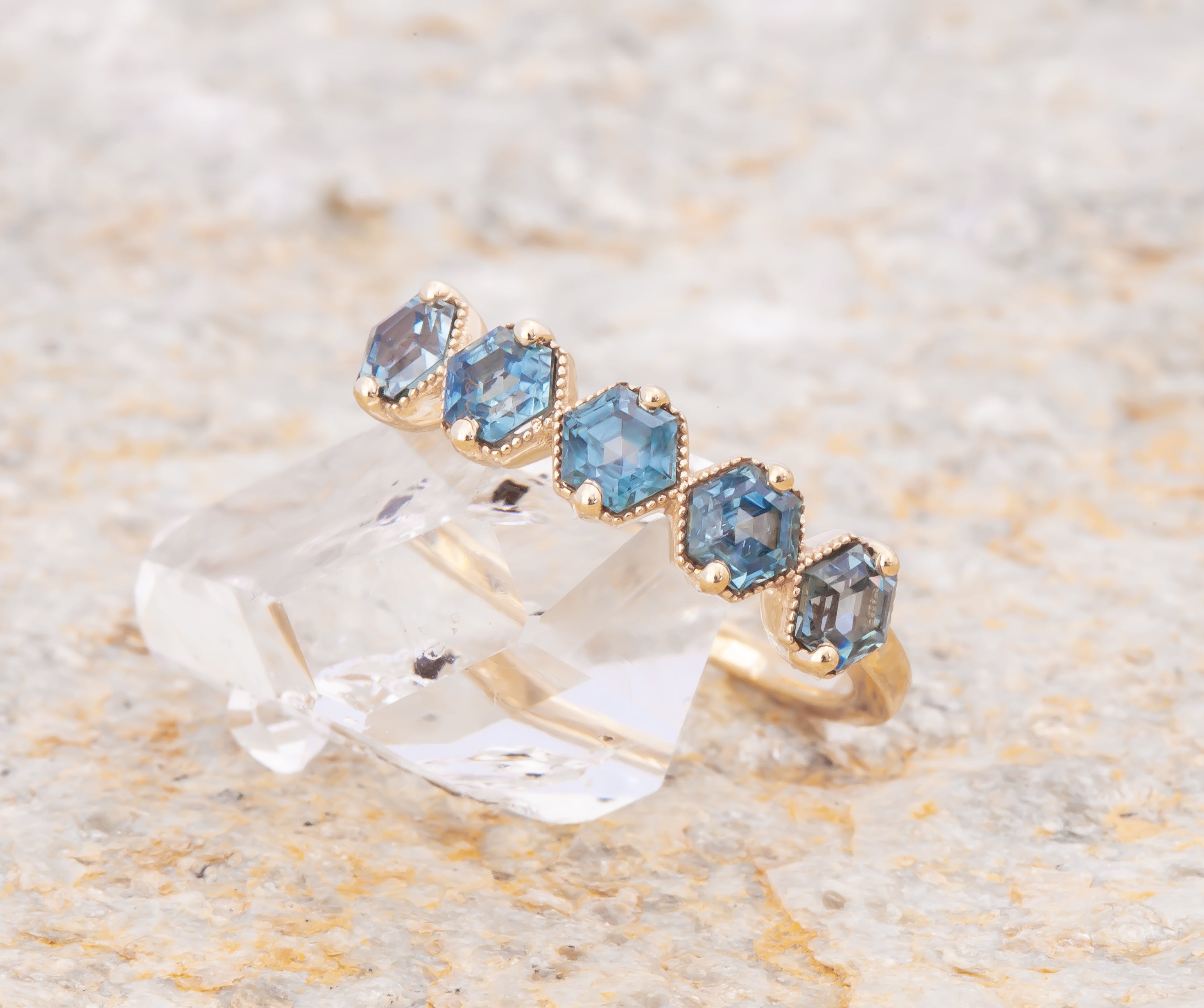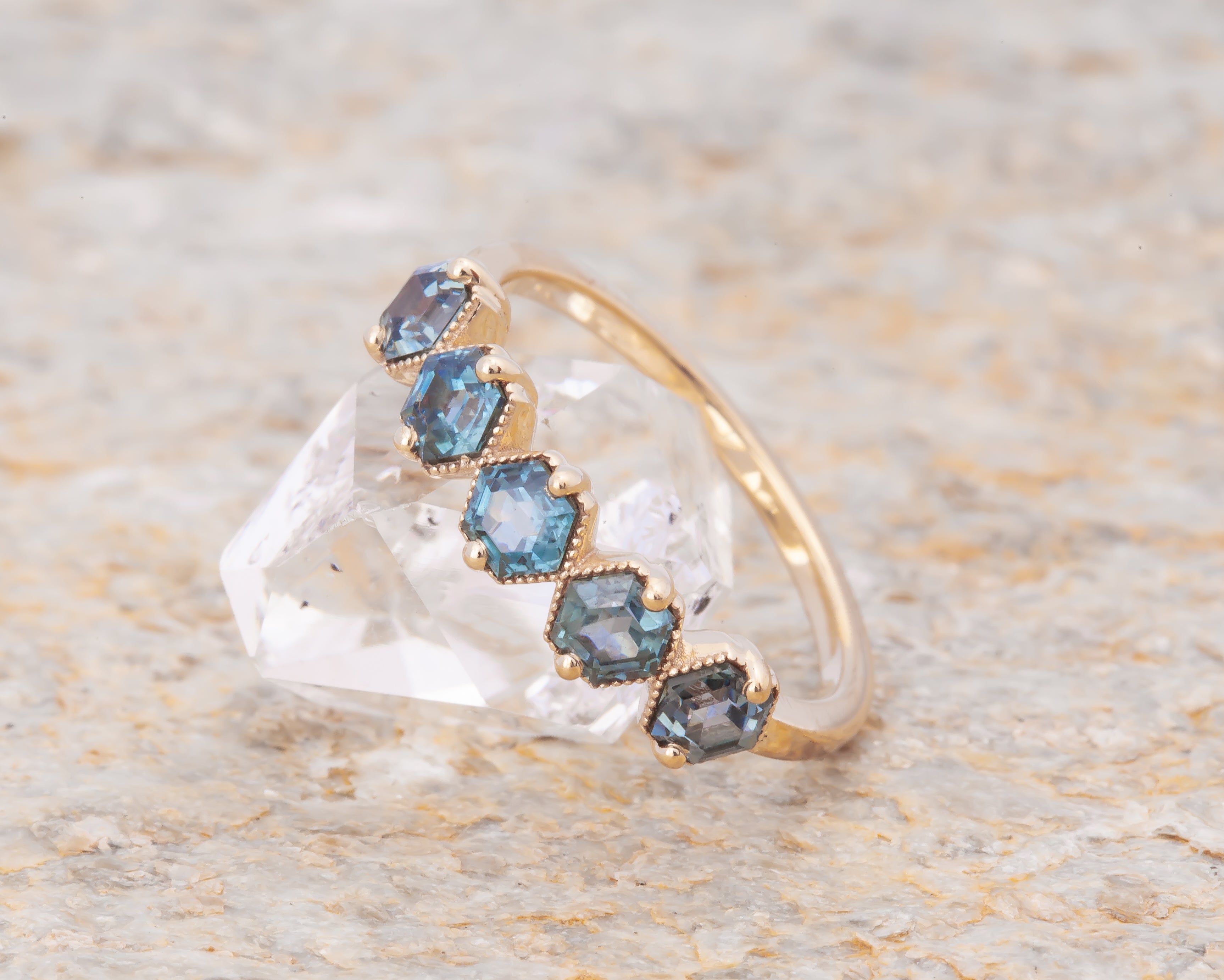 14k yellow gold with five 3.5mm grey step cut hexagons across the top of the finger and ring. 1.50cts of Montana Sapphire.