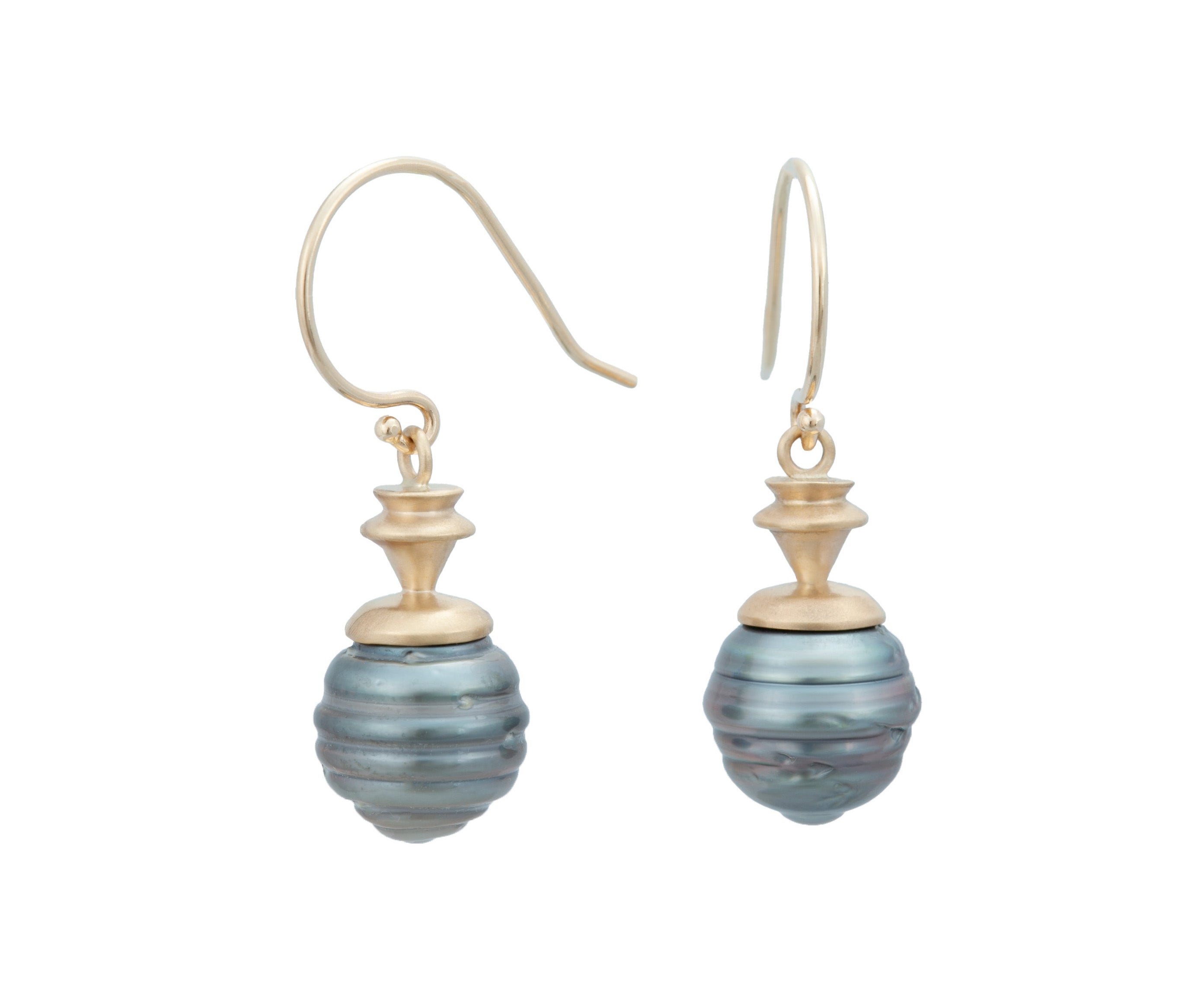 Steel grey Tahitian pearls with ribbing and custom carved accents in 14K yellow gold. Measures 18mm x 9.8mm, 30mm with ear wires.