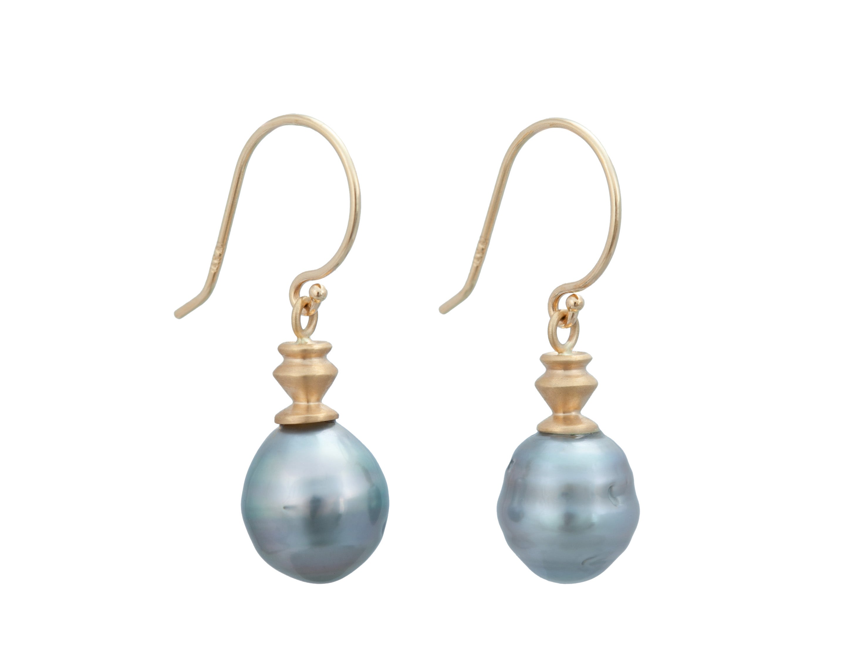 Silver Tahitian pearl earrings with custom carved accents in 14K yellow gold. Measure 18.3mm x 9.7mm, 30mm with ear wires.