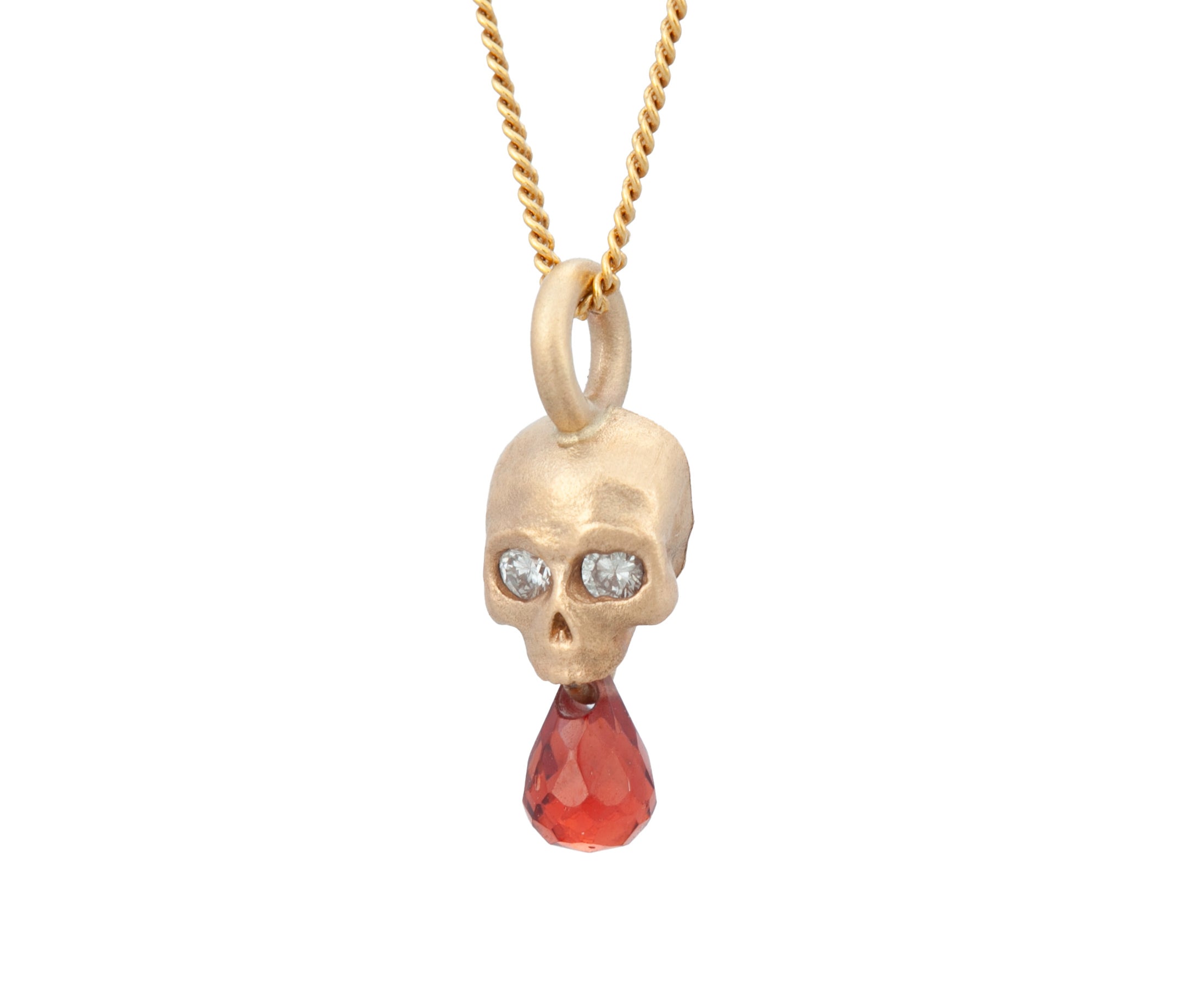 14k yellow gold skull pendant (slimmer than original) with hanging faceted teardrop garnet and diamonds set in eyes. Measures roughly 18mm x 5mm