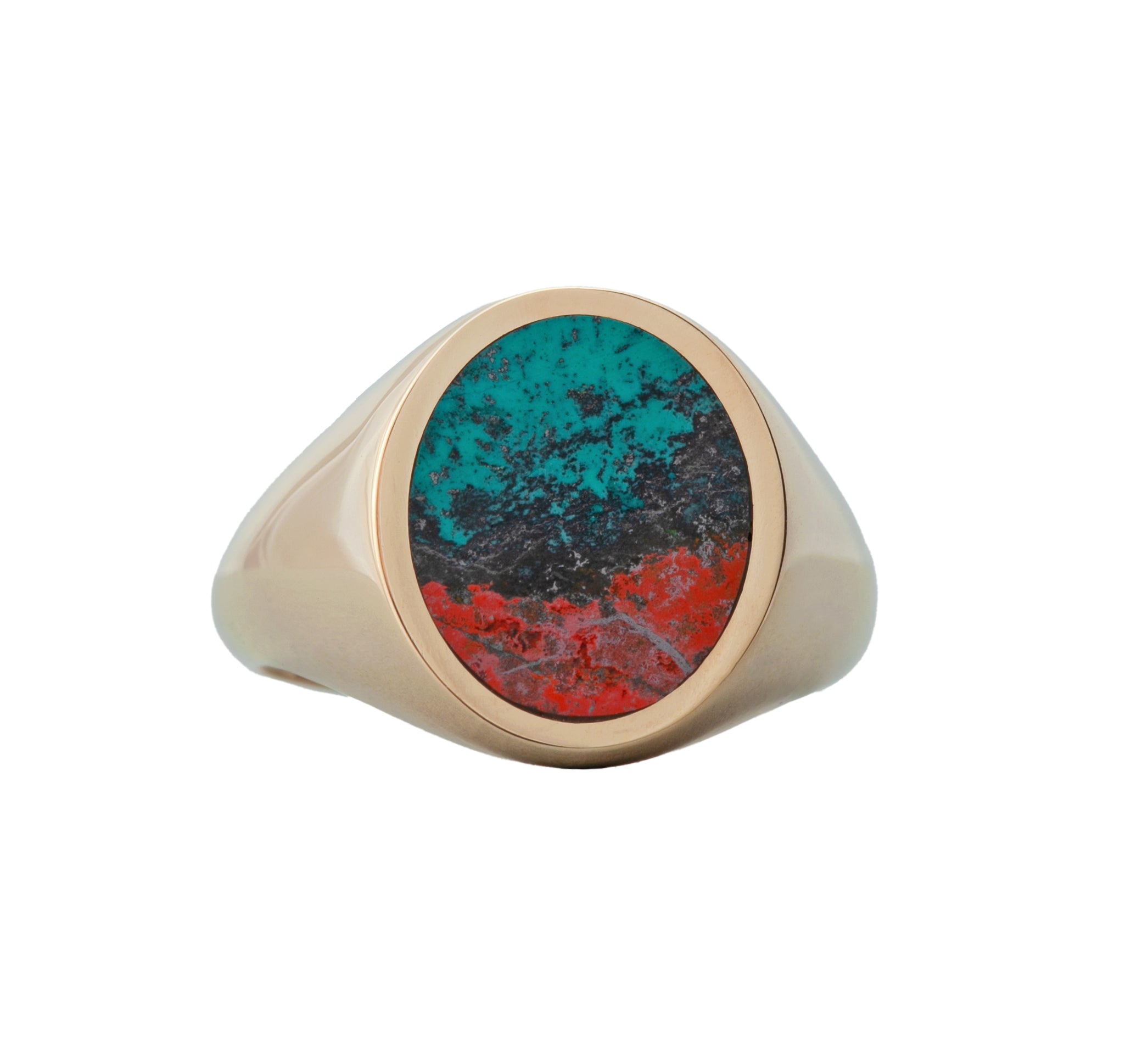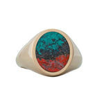 One of our 14K gold inlay signets featuring a vertical oval segment of Sonora Sunrise Chrysocolla from Mexico.