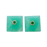 Chrysoprase is one of the most coveted varieties of chalcedony quartz and sought after for its vibrant green color. These stud earrings were cut in-house and features 14K yellow gold bezel set chrome diopside in the center with 14K yellow gold posts. The Chrysophrase is a lighter variety of chrysoprase.